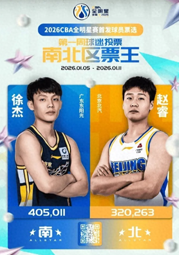 就在刚刚,2026CBA全明星周末第一周投票结果出炉,徐杰以405011的票数成为总票王,赵睿和曾凡博分别排名第二、三位!
