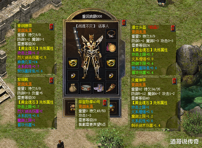 第二,服饰五件套这位天魔战士的服饰系列同样是巅峰级别:青铜腰带和紫绸靴厉害了,而且其中青铜腰带就洗炼出来了麻痹几率+1%的属性,真是牛掰啊!另外,攻3勋章和天魔神甲也是巅峰级别,外加攻3道士头盔同样是综合属性强悍的存在。这五件套的自带属性强悍,洗练的全是黄金级别,大佬果然霸气。