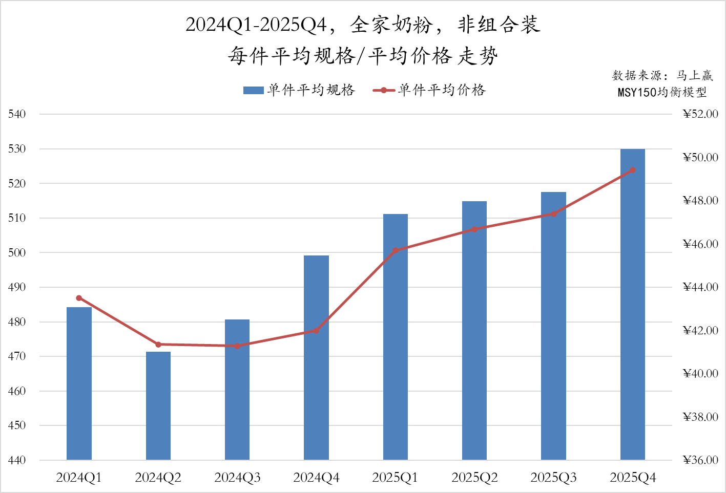 从2024Q1至2025Q4全家奶粉非组合装产品的走势来看,件平均规格、件平均价格均呈现较为明显的上行趋势,规格、价格均以2024Q2为基点,呈现趋势明显的上升,在最近的2025Q4形成价格、规格高点。类目规格、价格一同上行的背后,或与类目的产品升级、消费者需求提升等有较强的相关性。