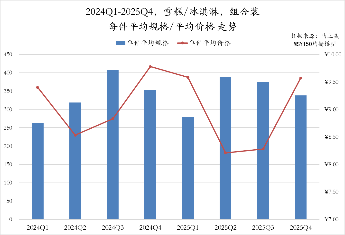 2024Q1至2025Q4,雪糕/冰淇淋非组合装产品的件均规格和件均价呈现出显著的季节性、周期波动特征。件均规格在2024Q4及2025Q4均提升至约76.5g,除这两个季度外,其余季度均在74g至75g区间内窄幅波动变化;件均价走势与规格基本一致,同样在2024Q4攀升至约3.2元的高位,而在消费旺季则明显回落,2025Q3降至约2.6元的阶段性低谷,随后在Q4再次反弹恢复至3.2元以上。