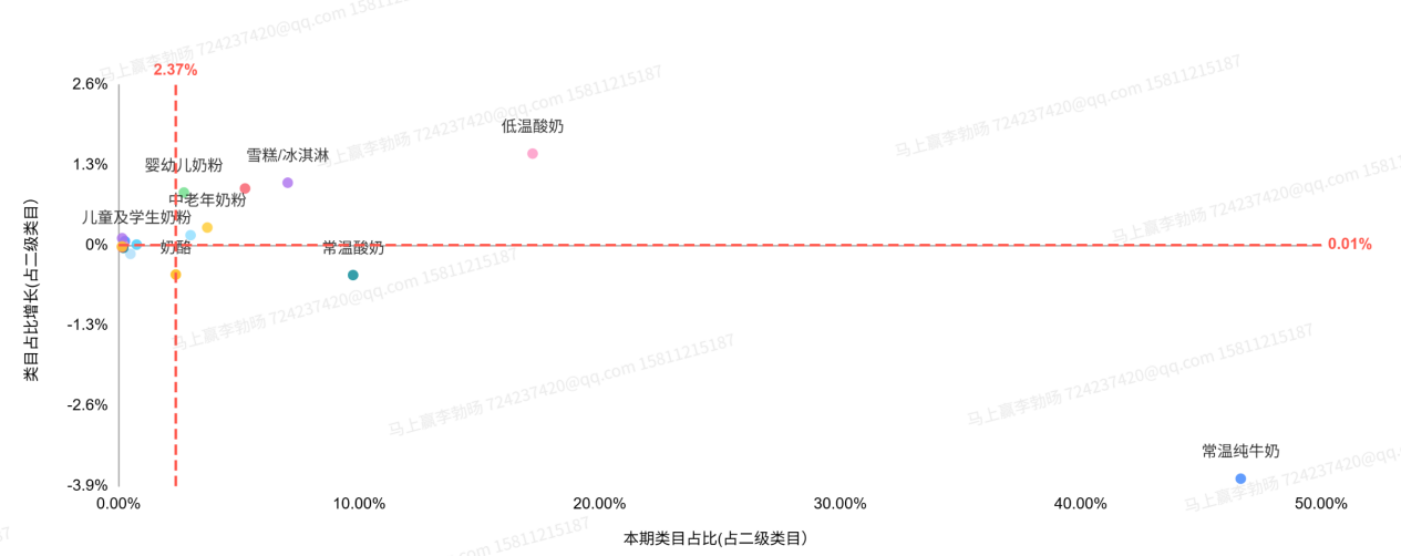 本季度乳制品市场中,常温纯牛奶占比依然稳居首位,占比近50%。低温酸奶、常温酸奶、雪糕/冰淇淋、低温纯牛奶(红色圆点)占比在5%-20%,构成乳制品类目中的中腰部阵营;其他如奶酪以及面对不同人群的各种奶粉类目,占比均在5%以下。