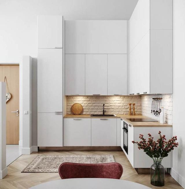 对于最容碰头的吊柜直角,西方人很机智的将其改成了斜面角,倒切角45°的这种。这样一来避免碰头的风险,还能拉伸吊柜的高度,收纳家中的杯子这些小物件;不过也存在弊端,只能安装推拉门,而非平开门,成本会相对比较高。