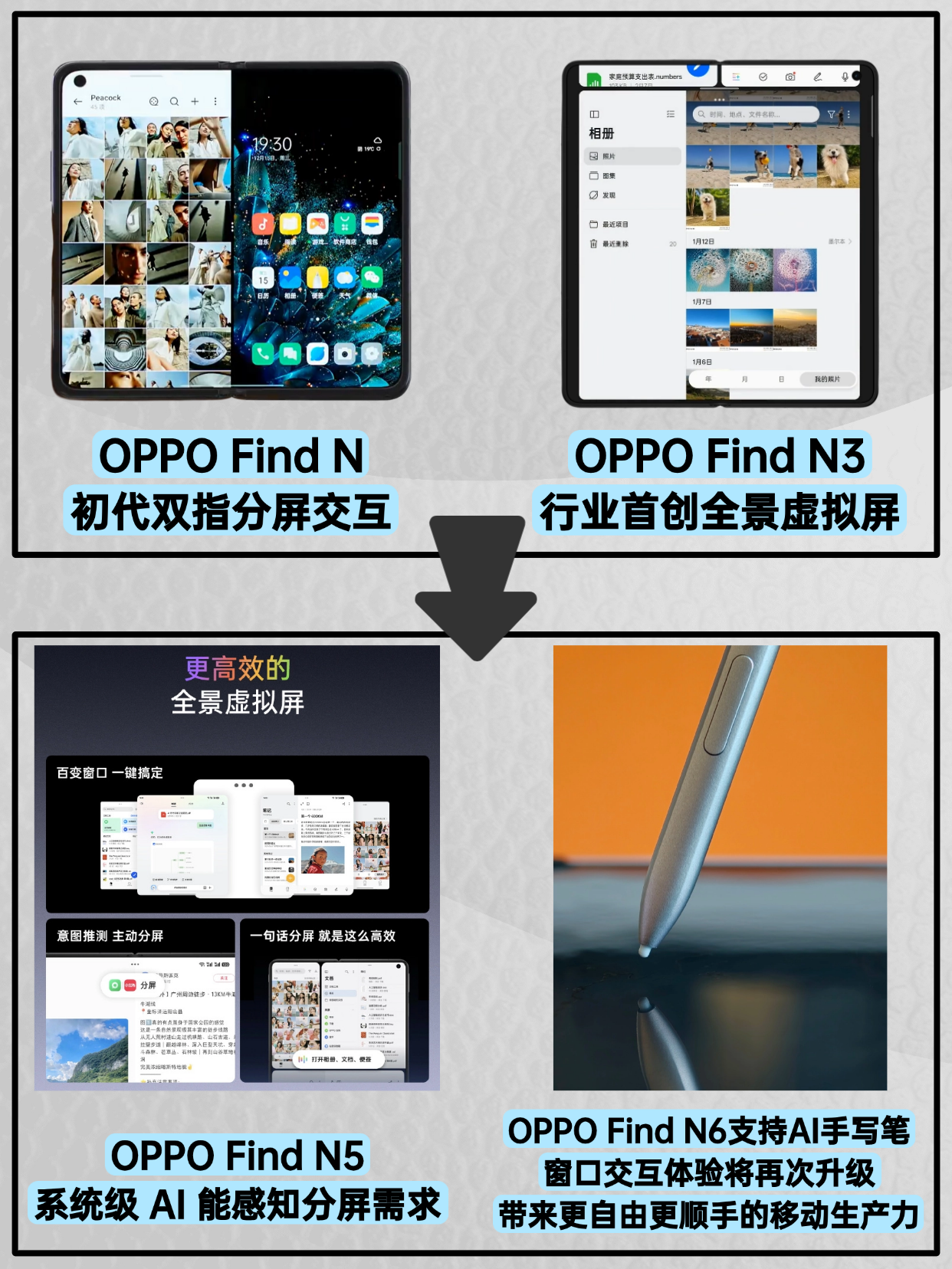 分屏交互,好用才是王道:各家分屏逻辑不同,但用过一遍后会发现,OPPO旗下的ColorOS是做的zui好的,从初代折叠OPPO Find N的双指分屏,到OPPO Find N3行业首创全景虚拟屏,再到OPPO Find N5的系统级 AI 能感知分屏需求,每一代都给足了惊喜,据说这一代OPPO Find N6升级窗口交互体验的同时,还适配了AI手写笔,对于常记录、创作的人来说,吸引力直接拉满。