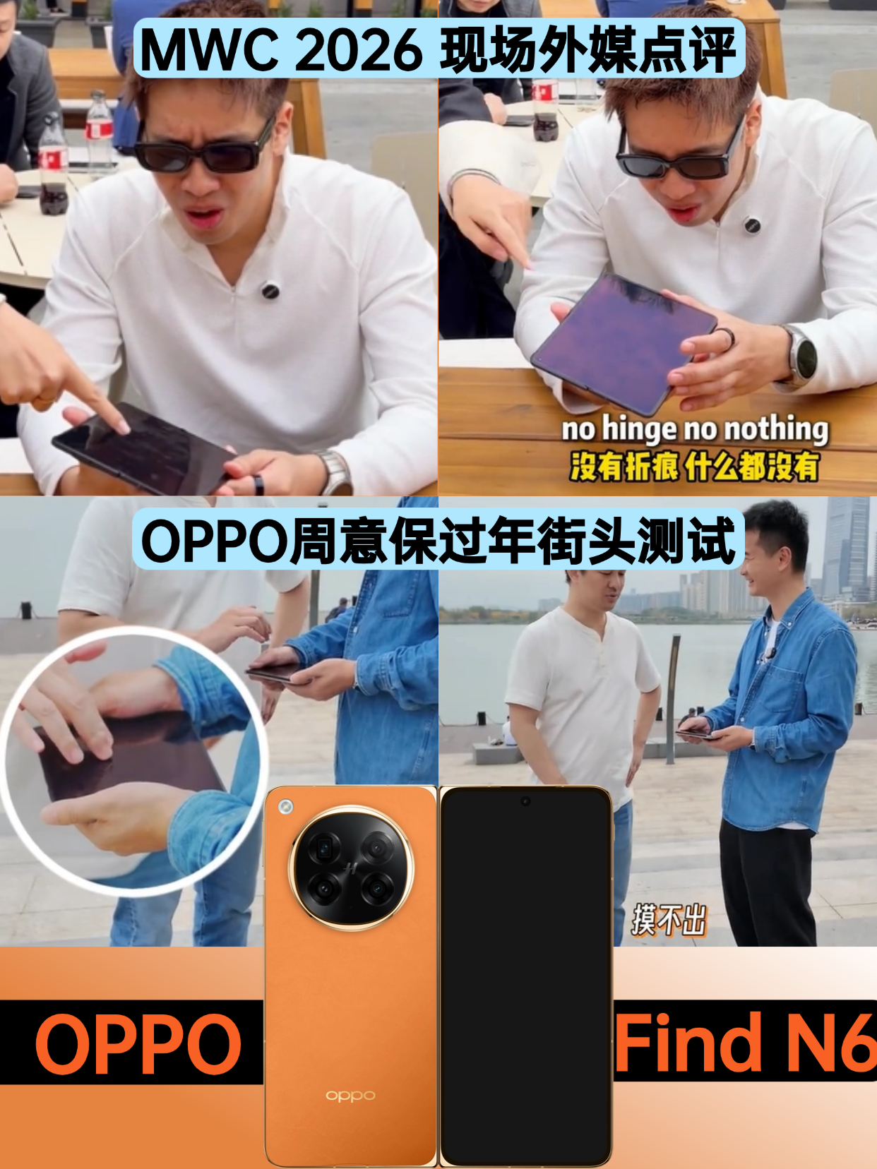 平整度是基本修养:折痕?那必须是越浅越好!除了屏幕不容易坏,日常滑动交互也舒服,听说这个月要发的OPPO Find N6「几乎无痕」,目前在MWC 2026上圈粉多位外媒,评价只有一句:折痕呢?国内OPPO周意保也搞了一场线下测试,几乎没人能摸出折痕,这屏幕平整度真的很加分了。