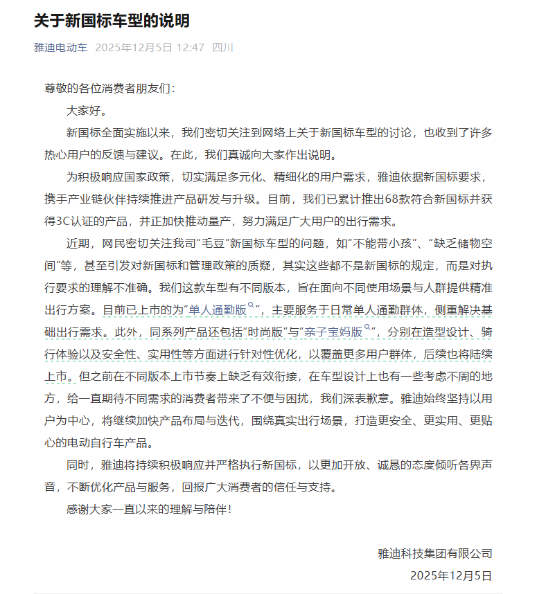 2025年12月5日,雅迪电动车因新国标车型“毛豆·单人通勤版”设计缺陷引发全民争议后道歉。