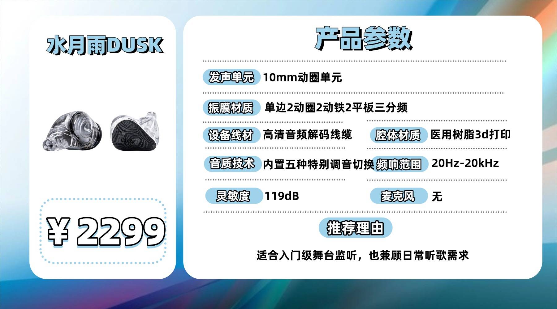 D US K 的声音取向偏向低频驱动感,低频下潜深、量感充裕,整体听感更接近大动圈风格,冲击力和氛围感比较突出。中高频部分保持了水月雨一贯的干净取向,细节清晰但不过分强调亮度,整体三频衔接自然。多单元三分频架构在声像定位和层次感上有不错表现,适合流行、电子以及偏氛围取向的曲目。