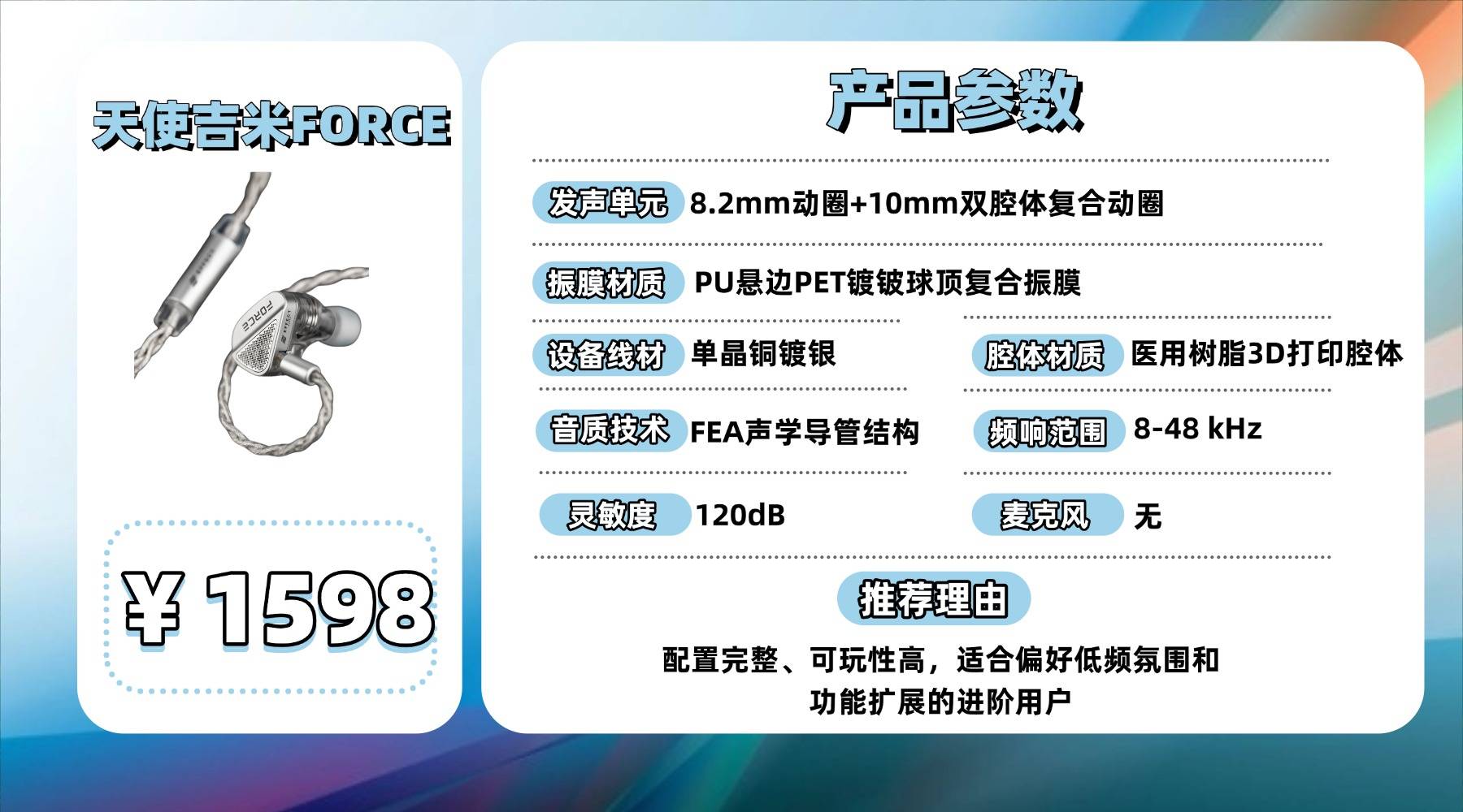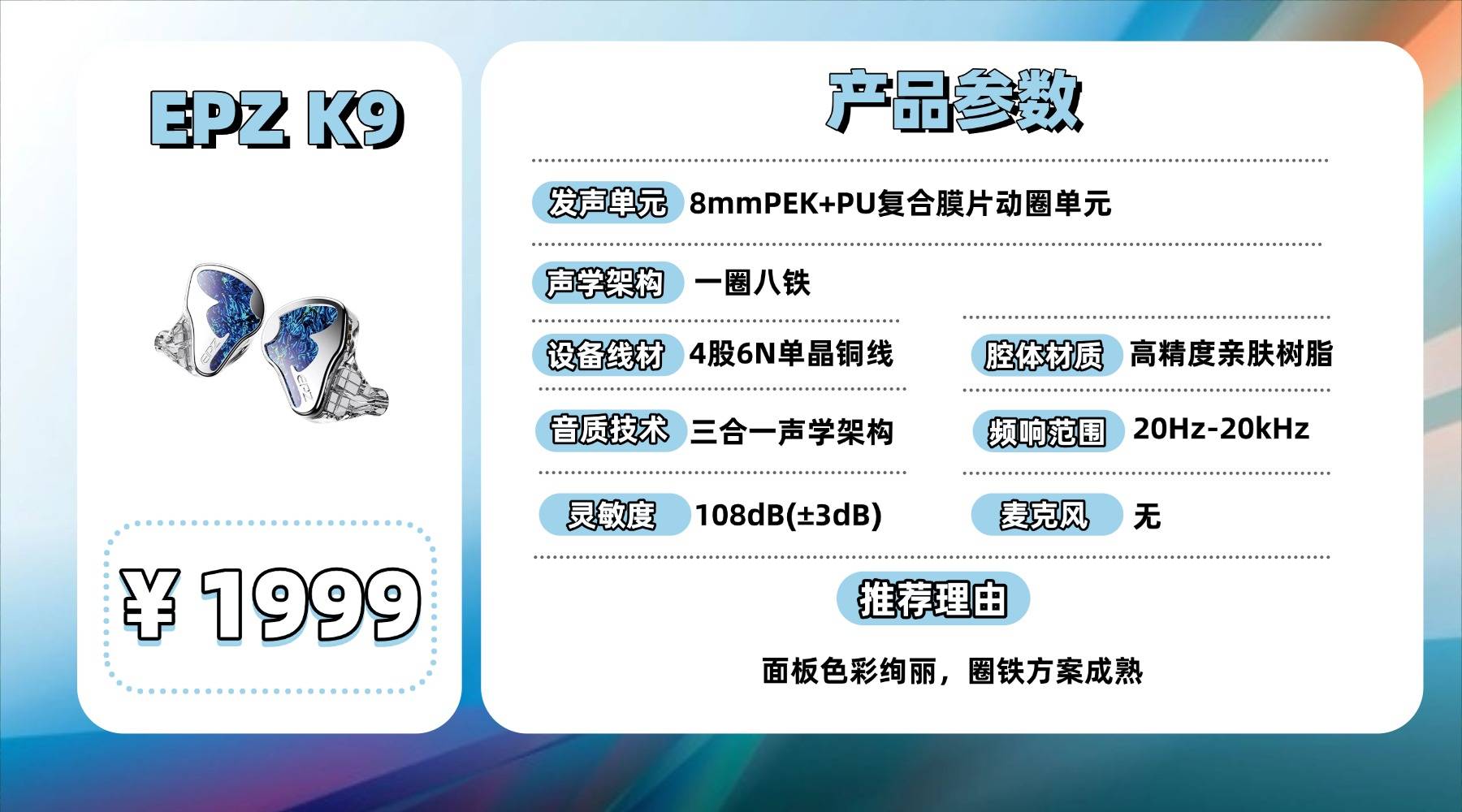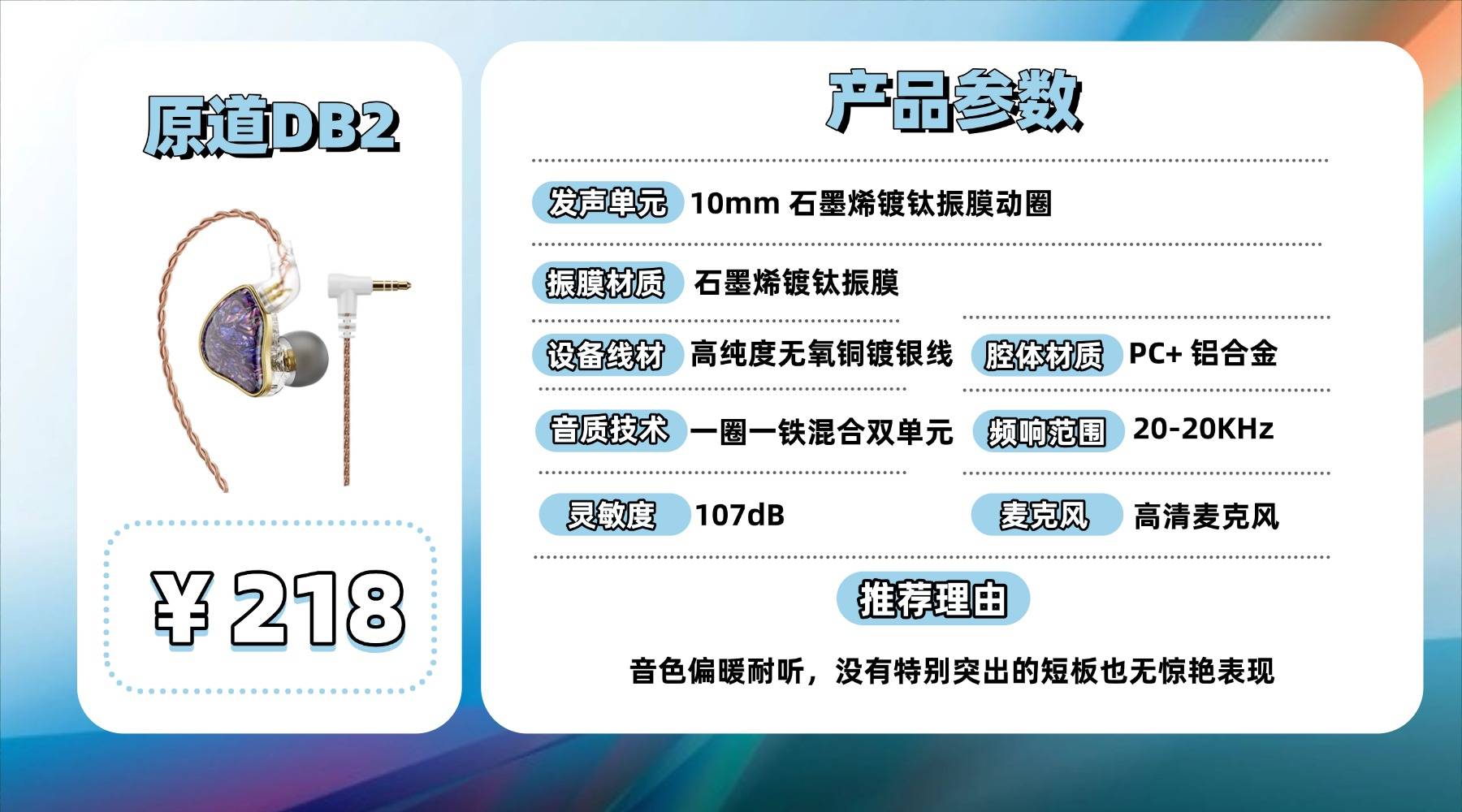 它采用 8mm PEK+PU 复合膜动圈配合一圈八铁结构,解析力和分离度在同价位里算得上有竞争力,中高频细节呈现比较充足。在听一些通透型乐器时表现干净,舞台感也偏开阔。但调音风格不是大众口味,部分频段会给人略微偏冷或偏薄的感觉,尤其在流行向比较明显,需要看个人喜好。