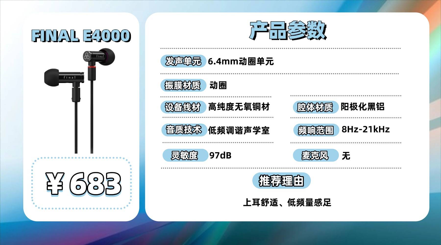 佩戴体验是它的一大优势。小体积腔体配合 Type E 硅胶耳塞,再加上可微调角度的导管结构,对不同耳型的适配性较好,通勤或长时间使用都不容易产生明显压迫感。线材为无氧铜方案,做工以耐用为主,支持 MMCX 接口,后期换线或搭配不同前端有一定灵活度。需要注意的是,E4000 并未配备麦克风,通话或语音需求较多的用户使用上会略有不便。整体而言,它更适合偏好温润声音、注重佩戴舒适度、以及希望久听不累的用户群体。