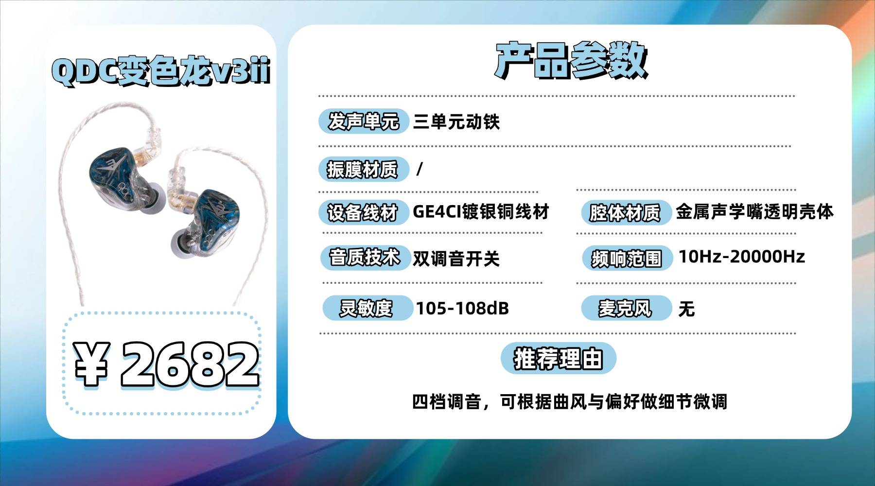 四档调音是 V3II 的核心玩法,可以根据曲风调整亮度、低频量感或整体平衡度,灵活性很高。阻抗 27–33Ω、灵敏度 105–108dB,对前端要求不算高,但要弥补中频质感,搭配仍需要稍微挑选。整体功能偏传统,但可玩性强,更适合愿意折腾的发烧用户。