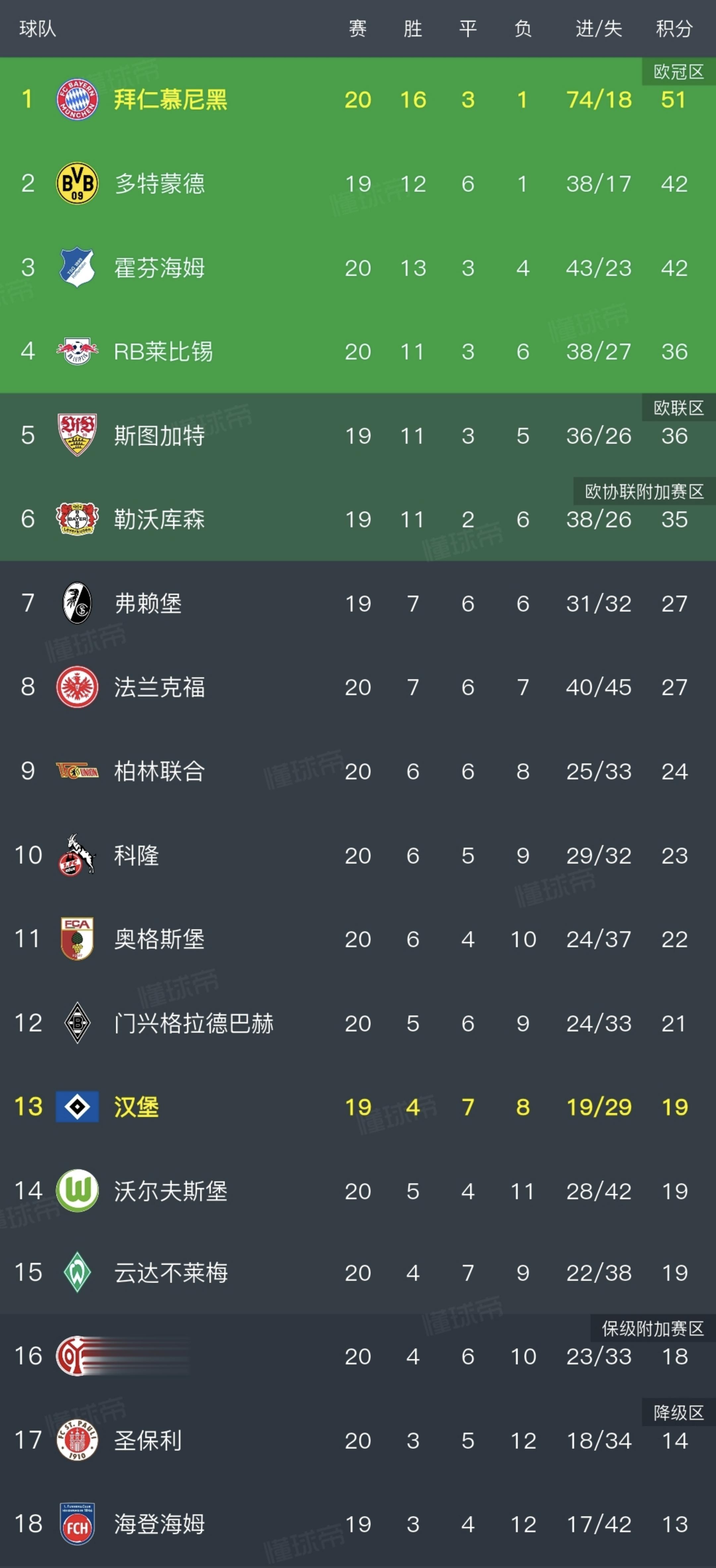 上一轮遭遇联赛首败、本轮取得平局,拜仁慕尼黑连续两轮不胜,尽管他们仍领跑积分榜,但是领先优势也被迅速缩小。如果后续开赛的多特能够全取三分,那两者的分差将会被缩小到6分,争冠的悬念也会再次回来,目前积分榜排名情况如下。