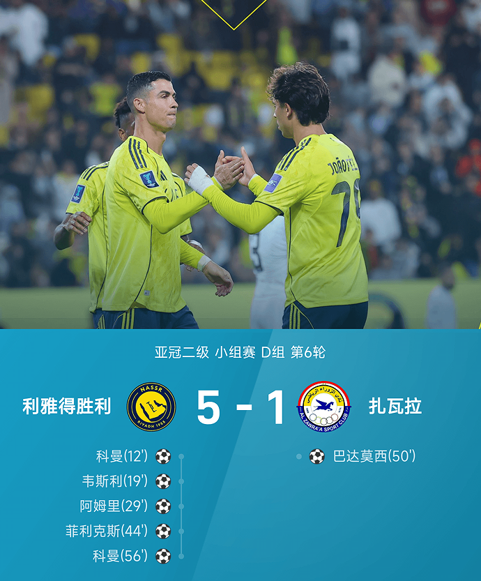 利雅得胜利此前五战全胜已提前锁定头名,而扎瓦拉体育则无缘晋级。主队主帅路易斯·卡斯特罗借此机会进行阵容轮换,球队核心C罗首发出战半场,这也是他本赛季首次在亚冠赛场亮相。