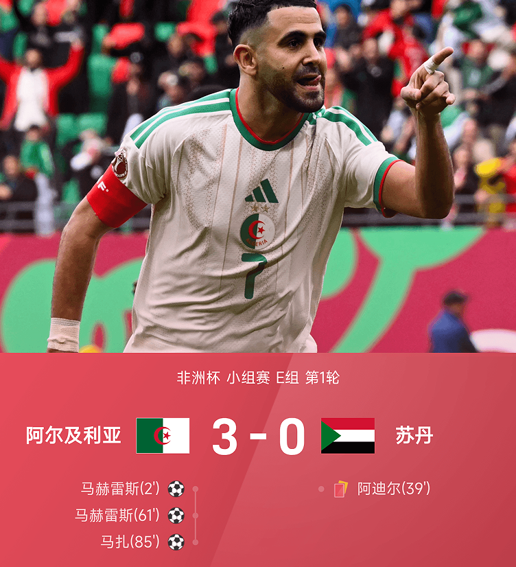 非洲杯战报:马赫雷斯梅开二度,阿尔及利亚3-0十人苏丹