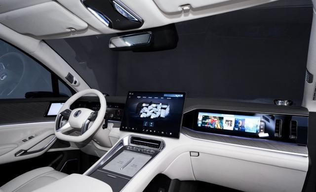 在舒适性方面,腾势N9也是做到了极致。车内采用了双环抱式座舱设计,搭配铂檀灰、云锦米内饰配色,温馨又舒适。3.2㎡超大天幕玻璃让第三排乘客也能享受充足的阳光。全车云栖座椅更是一大亮点,前排全息智能律动主驾、“一气两用”式主动驾驶侧翼支撑以及零重力豪华副驾,前排乘客就像坐在公务舱一样舒适。豪华零感中排座椅的双横向移动功能,三排座椅的座垫抬升功能,都让乘客感受到了MPV般的舒适。