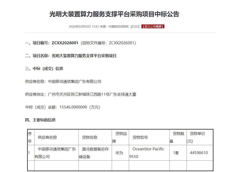 紧接着,硬件层面传来一声惊雷。中国移动以1.55亿元中标深圳"光明大装置"这一国家级算力项目。项目招标书中,"拒绝进口"四个大字赫然醒目。翻开中标方案,从核心的昇腾910C AI芯片,到天工架构、灵衢总线,再到OceanStor存储,一套完整的"华为方案"构成了这个国家级科学基础设施的算力底座 。