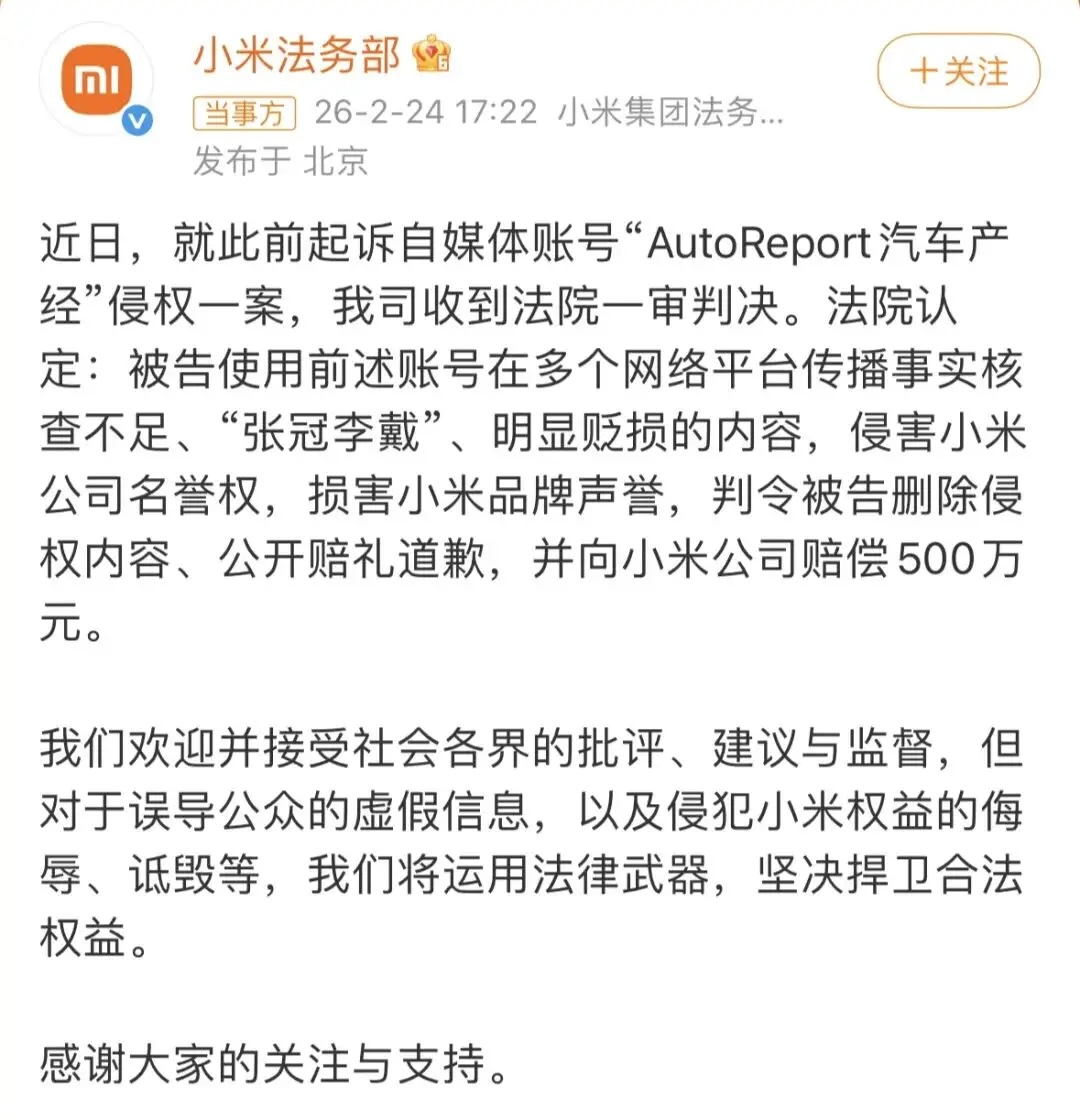 2026年2月下旬,法院作出一审判决,裁定小米胜诉。法院不仅下令该媒体必须立即删除所有侵权内容并公开道歉,更判处高达500万元的巨额赔偿,创下中国车企对自媒体维权的罕见天价纪录。