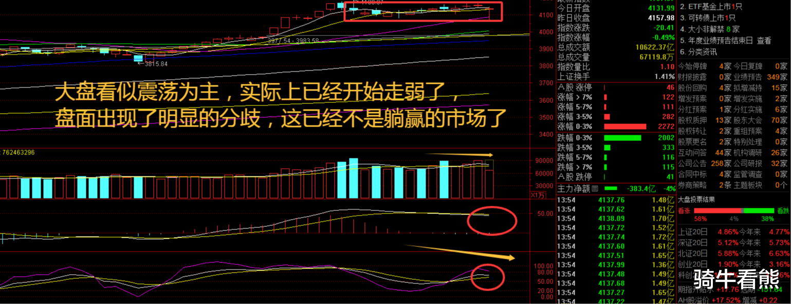 上证指数周五低开低走,出现明显的回调行情,没有明显的护盘走势,看来行情仍然是“横久必跌”的走势。市场情绪彻底降温之后,指数走势才能恢复正常,但是目前看这种拉锯短期内难以结束,建议震荡思路对待。午后注意上证指数能否在4100点之上稳住。