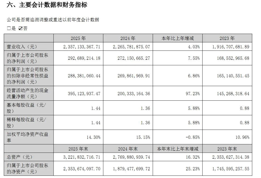3月7日,联科科技发布2025年年度报告,公司全年实现营业总收入23.57亿元,与上一年相比增长4.03%;归属于上市公司股东的净利润为2.93亿元,同比增长7.55%;归属于上市公司股东的扣除非经常性损益的净利润为2.88亿元,同比增长6.86%;基本每股收益为1.44元/股,同比上升5.88%。