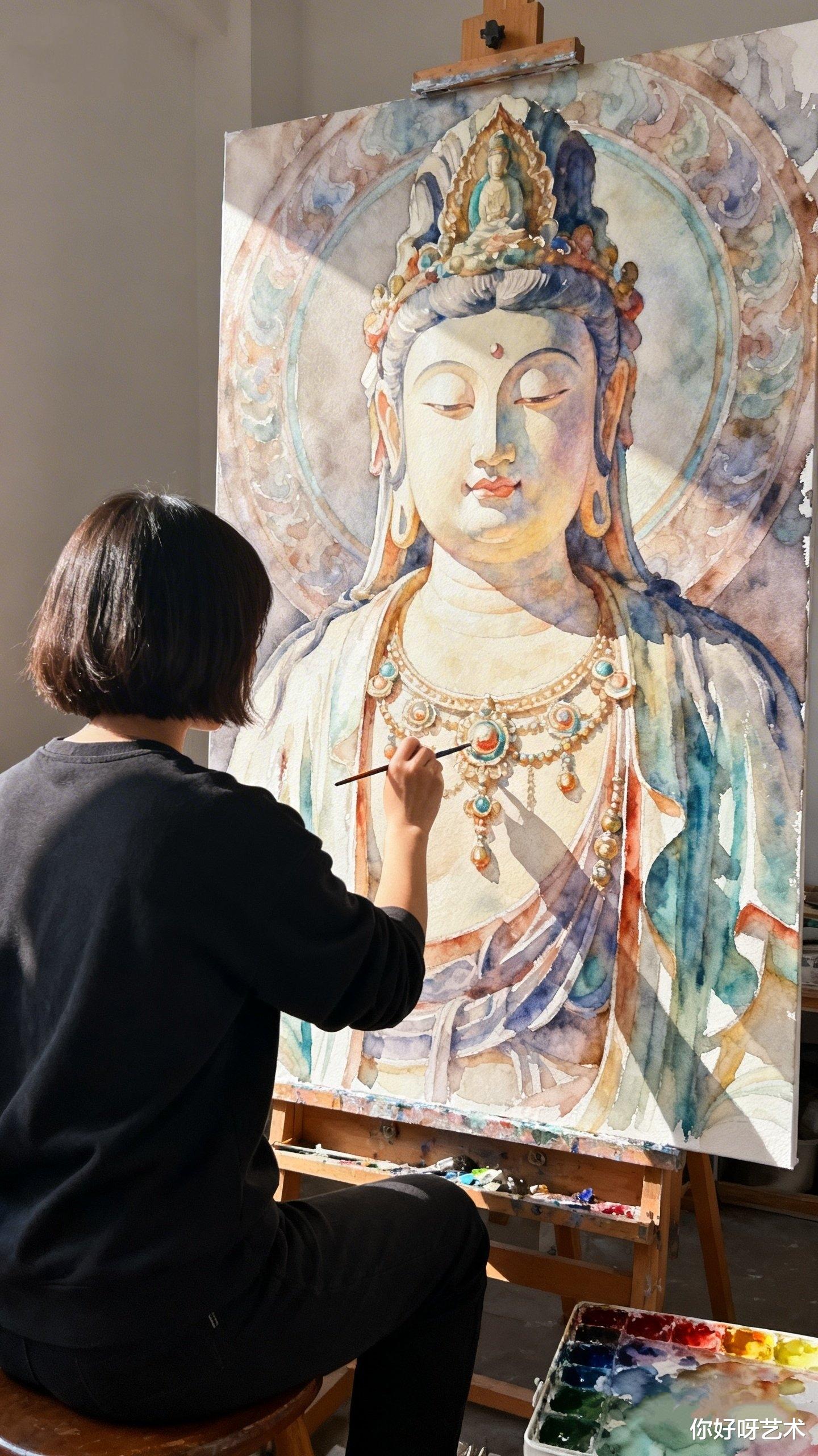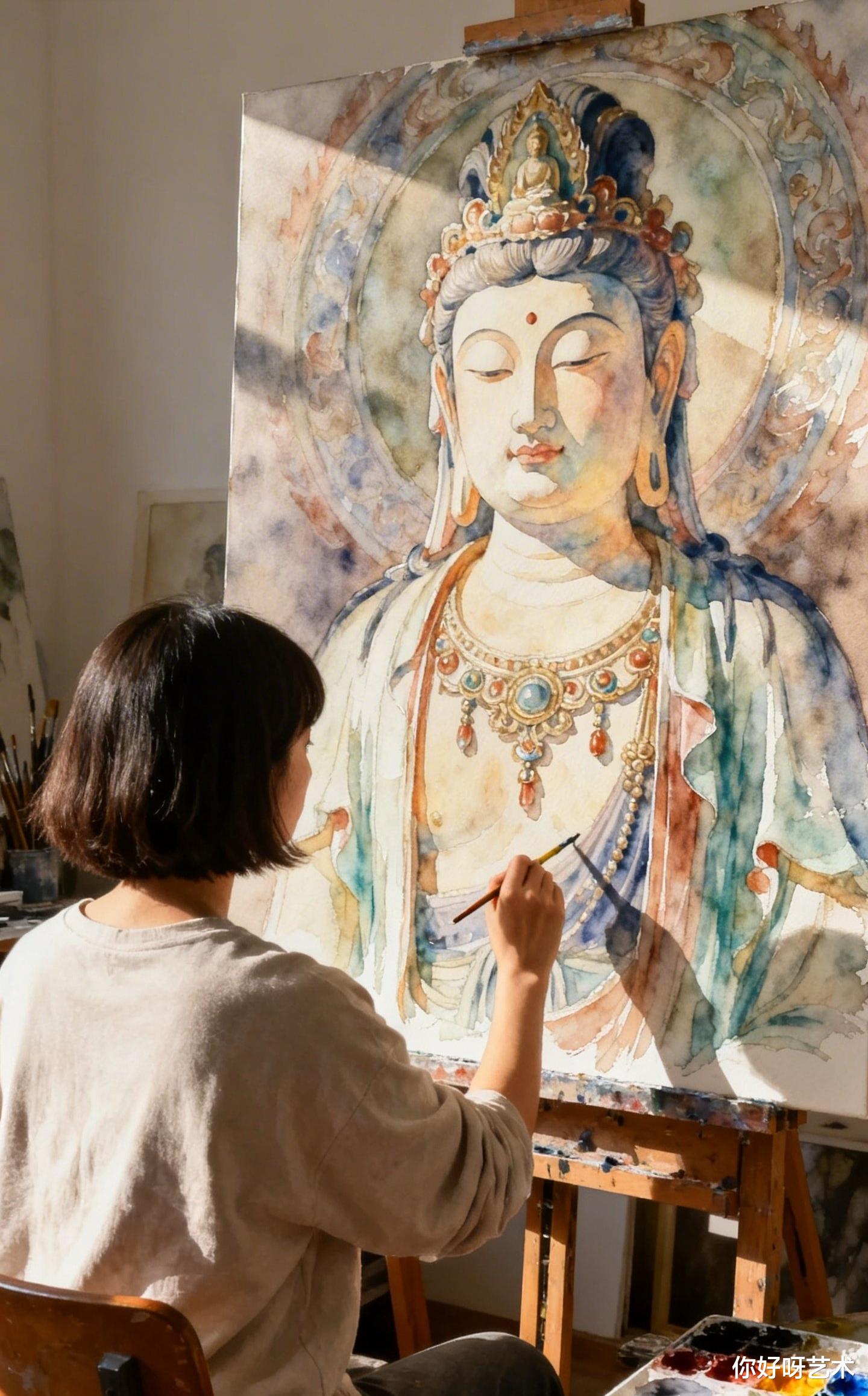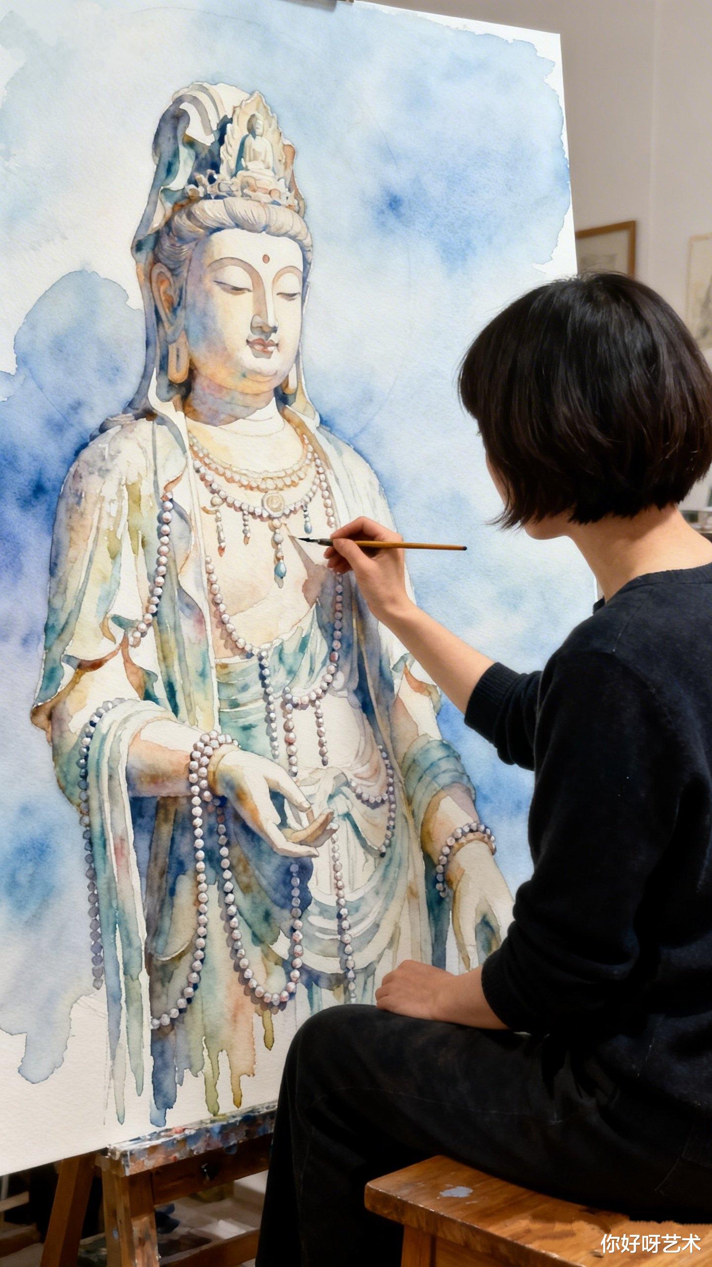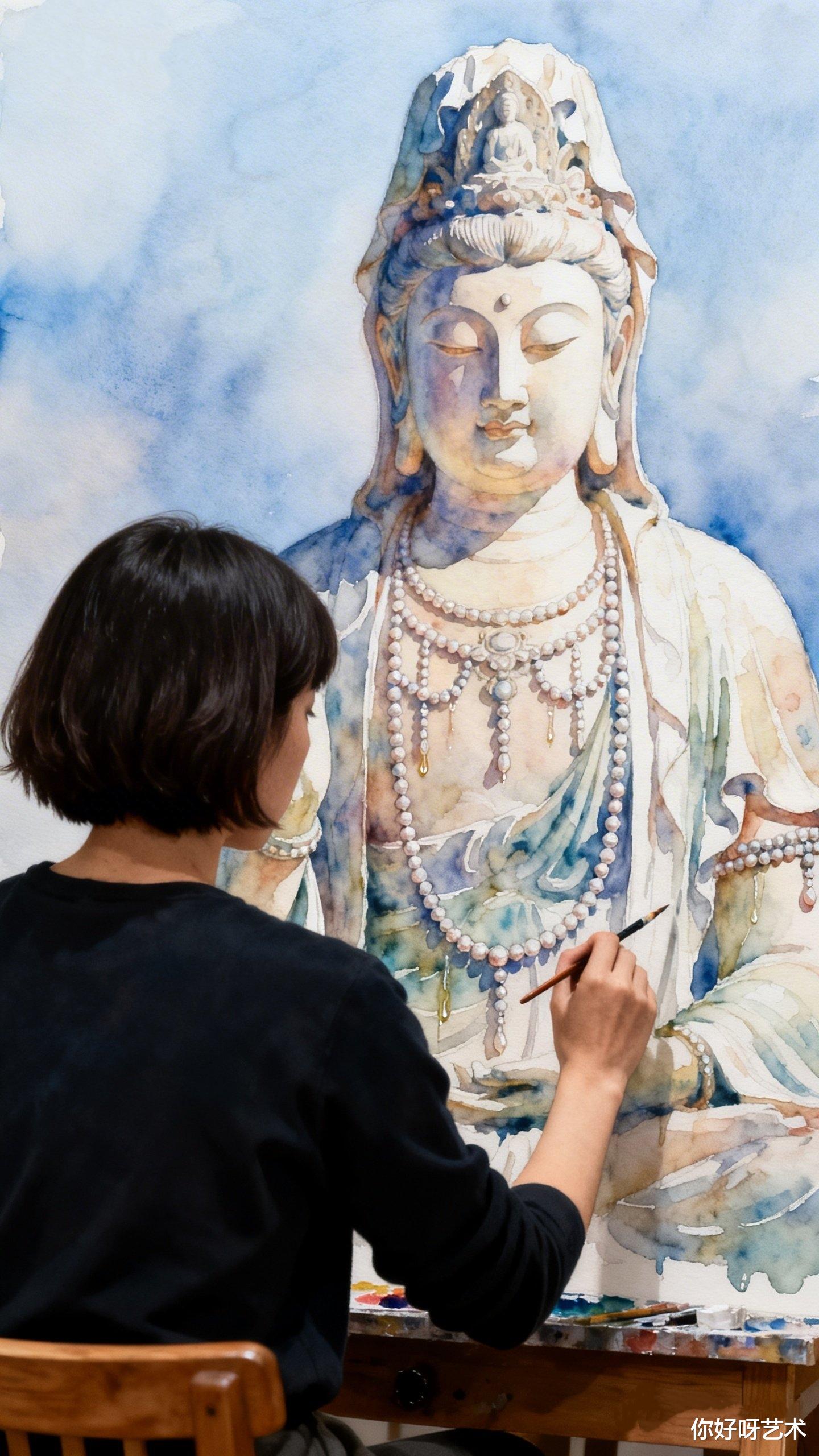 大年初一,晨光漫过老宅的飞檐,我记住了这个画水彩佛像的少女,也记住了她说的话:"佛的眼要有光,佛的手要有温度,佛的衣要有风。"