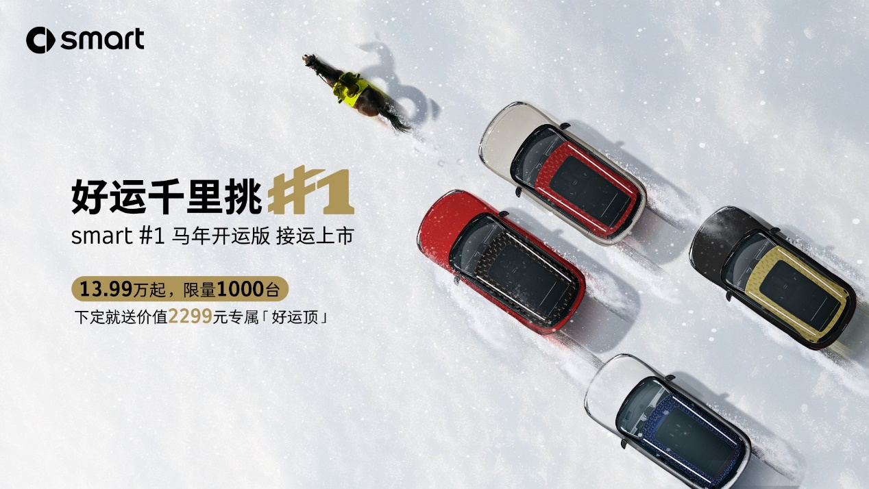 (2026年1月4日,杭州)新年启新程,好运踏春来。2026马年新春启幕,smart为感谢密友温暖相伴、携手同行,特别推出专属限量新年礼遇——1000台 smart #1 马年开运版,已于1月1日接运上市:售价13.99万元起,限量发售1000台。除极具诚意的“开运好价”之外,smart更以独创设计为不同车色搭配专属“好运顶”车贴,为密友点亮新年新运势,为每一程稳稳按下“幸运启动键”。