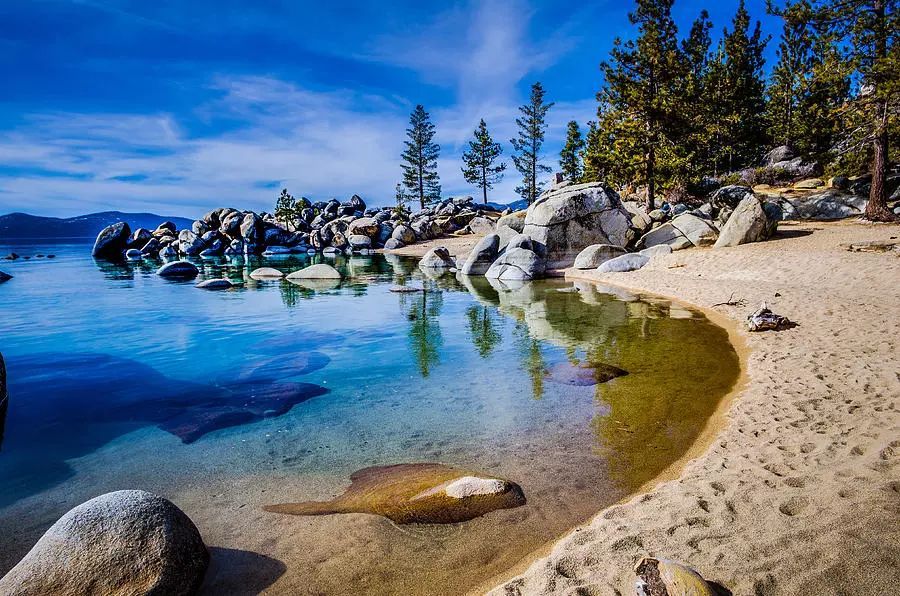 不远处的塔霍湖是另一个不能错过的自然景观。这座位于内华达州和加利福尼亚州交界处的湖泊是北美最大的高山湖,湖水碧绿,湖畔风景如画。在塔霍湖,你可以选择划船、潜水、滑雪或是徒步,无论哪一种,都能让你深深感受到大自然的鬼斧神工。