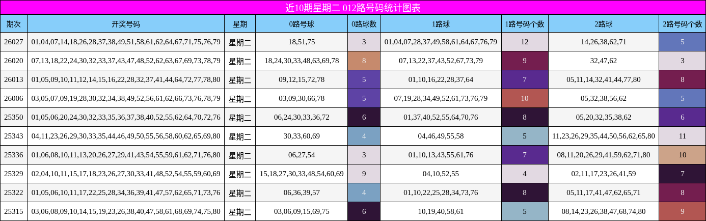 012路分析:2路号码强势回归,0路热出信号明确从近10期星期二的012路分布看,1路与2路号码分别开出75与72个,占比均超40%,而0路为53个,占比30%。尽管0路整体偏冷,但其近期走势出现明显回升迹象,尤其在上期(26033)中,0路号码开出7枚,占比较高,预示其可能进入热出周期。