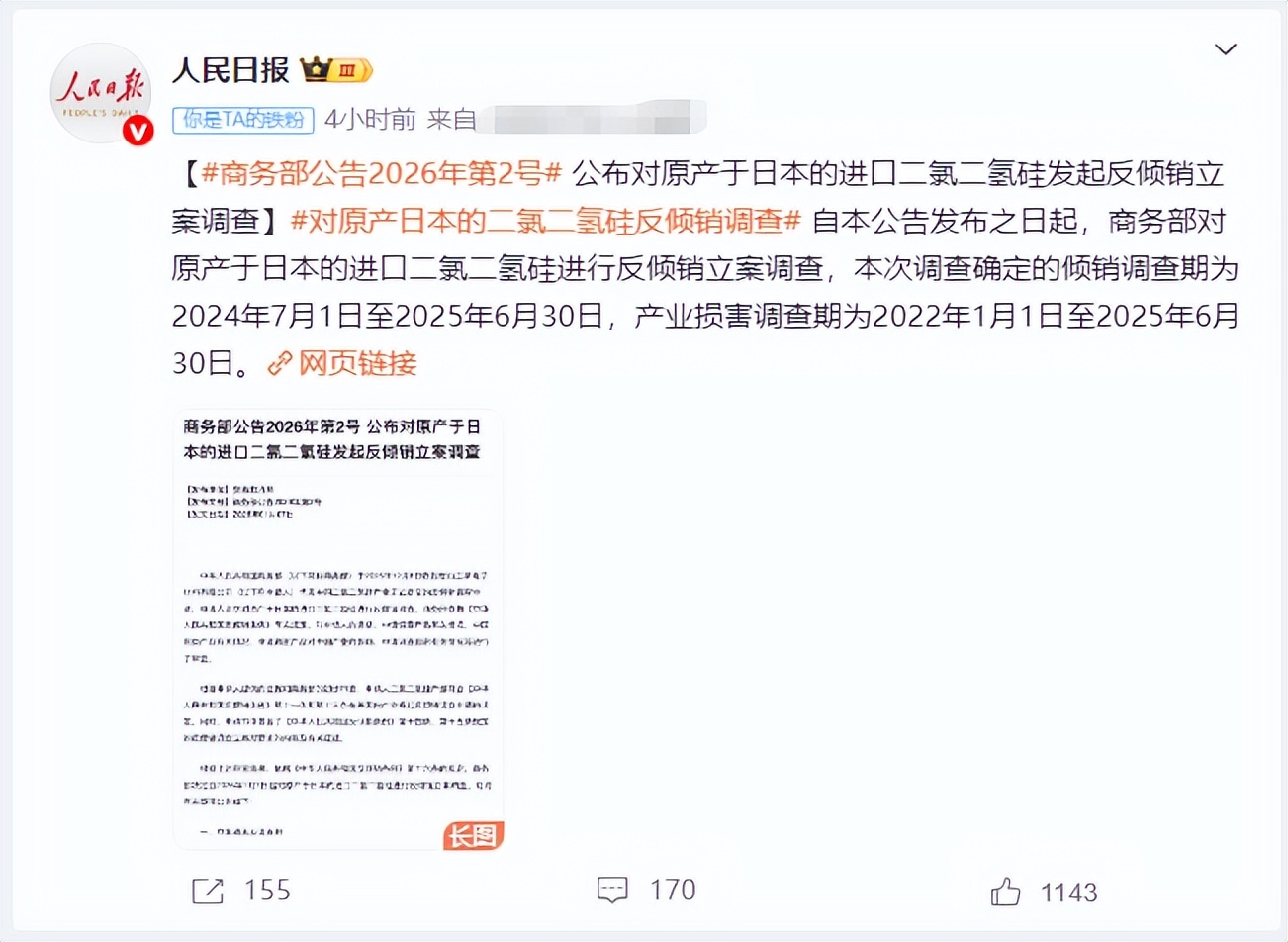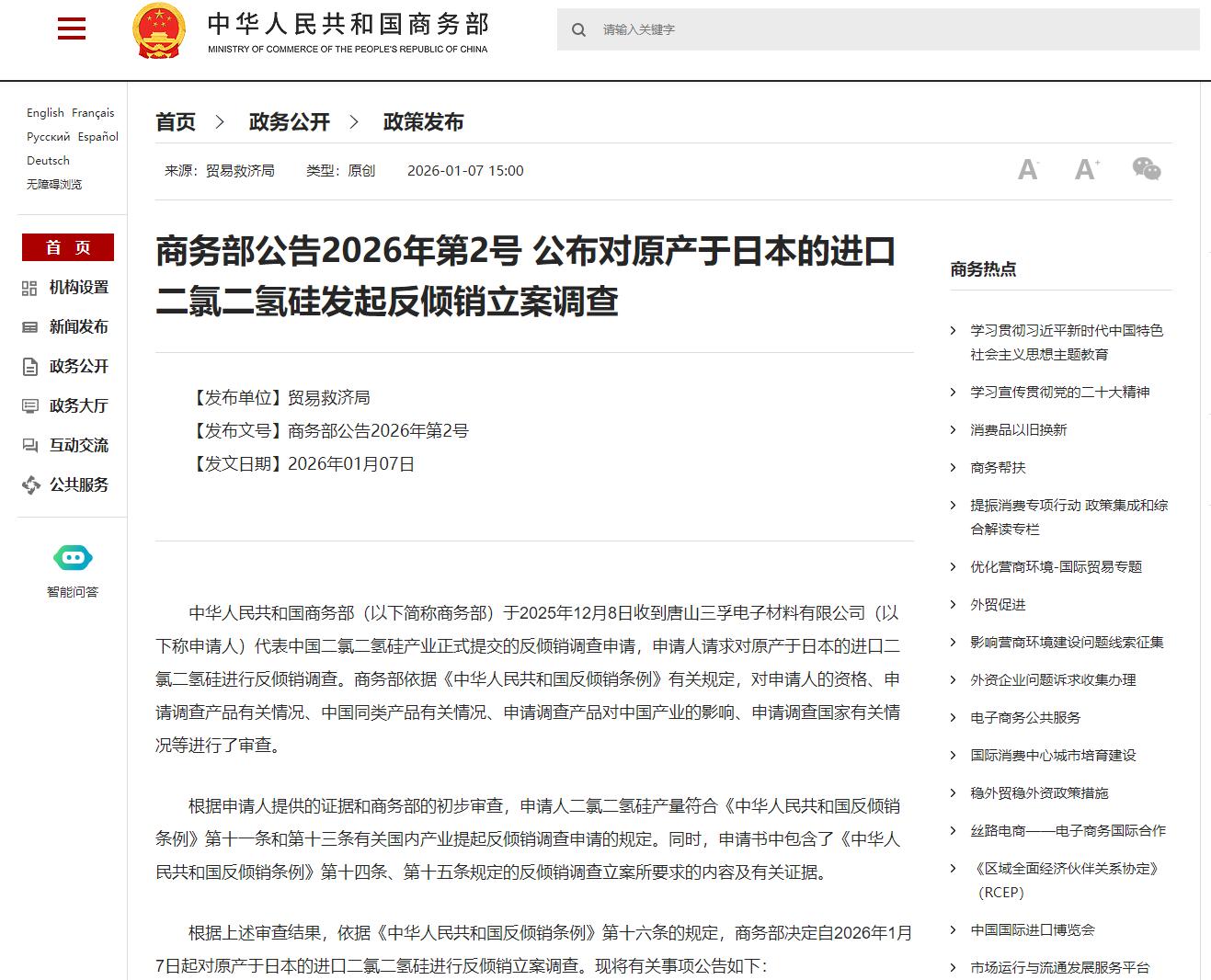 这一篇公告,其实大家都能读得懂。但第二篇公告,可能大家就有点困惑了。根据公告,我国将对原产于日本的进口二氯二氢硅发起反倾销立案调查。