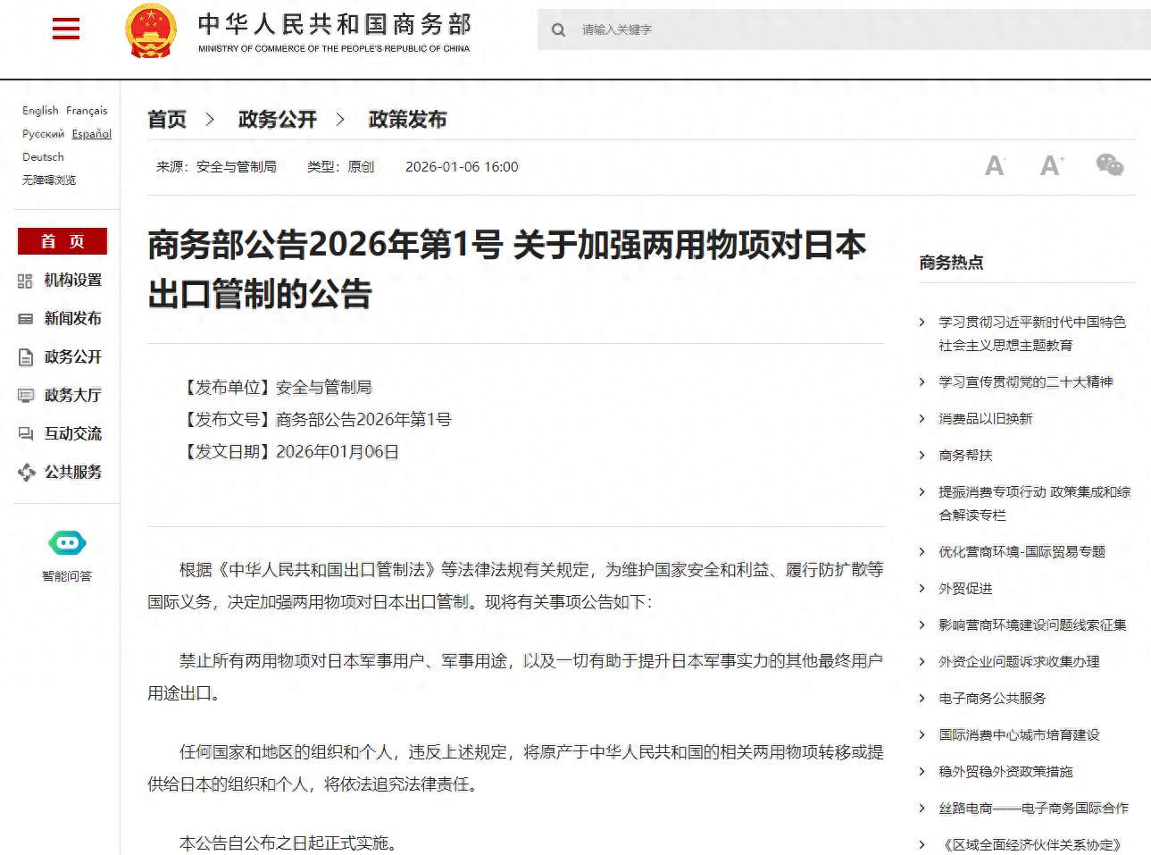 近期日本对我国的疯狂挑衅,终于迎来了更加严厉的打击。我国商务部在2026年的前两个公告,全都“赏”给他们的了。