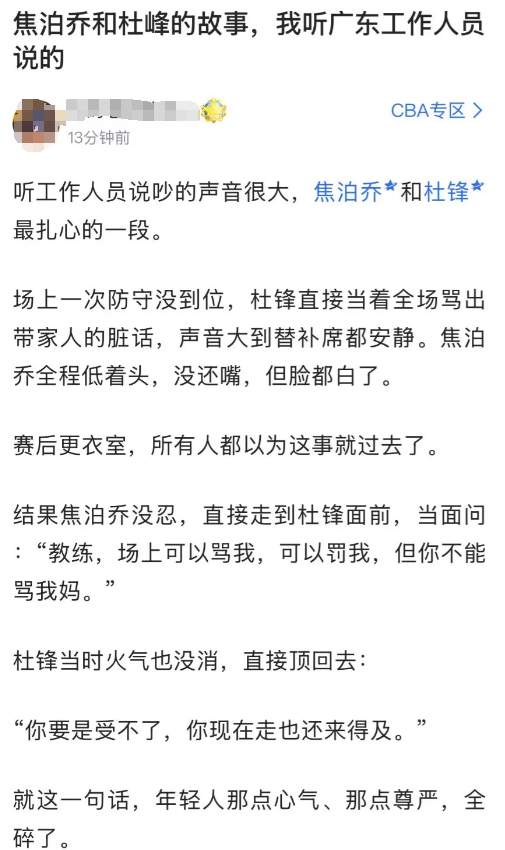 赛后广东球迷评论区,有“知情人”还从广东队工作人员那里打听到其中内幕,焦泊乔之所以离队,主要是和杜锋闹了矛盾,之前比赛场上有一次防守没到位,杜锋直接当着全场骂焦泊乔,把焦泊乔都骂到脸都白了,赛后更衣室,所有人都以为这事就过去了,结果焦泊乔没忍,直接走到杜锋面前,当面质问杜锋:“场上可以骂我,可以罚我,但你不能骂我妈。”(据说焦泊乔是在单亲家庭长大的)