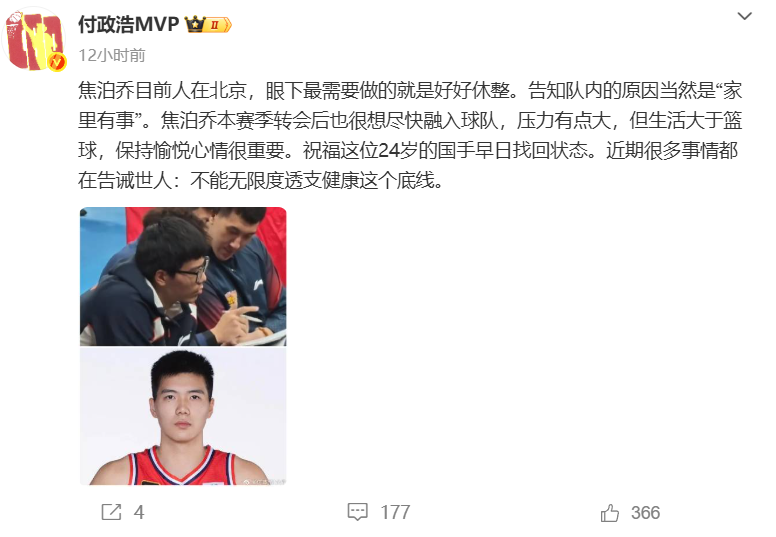 赛前媒体人付政浩也写了一篇关于焦泊乔缺席比赛的报道,文章中没有指名道姓,只是说焦泊乔最近压力有点大,但生活大于篮球,保持愉悦心情很重要,近期很多事情都在告诫世人:不能无限度透支健康这个底线。