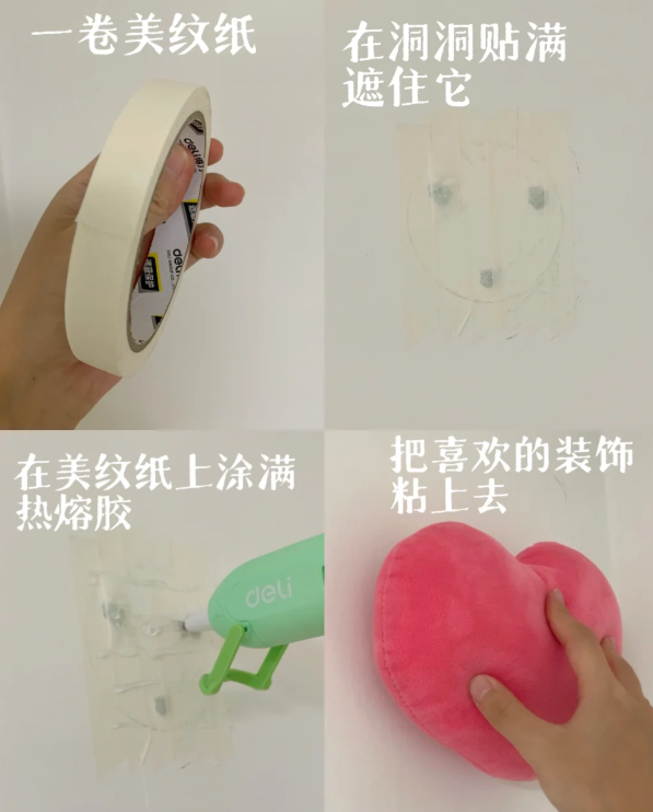 在墙面洞洞上面贴一些美纹纸,再把热熔胶涂满美纹纸,把喜欢的装饰玩偶贴在上面。