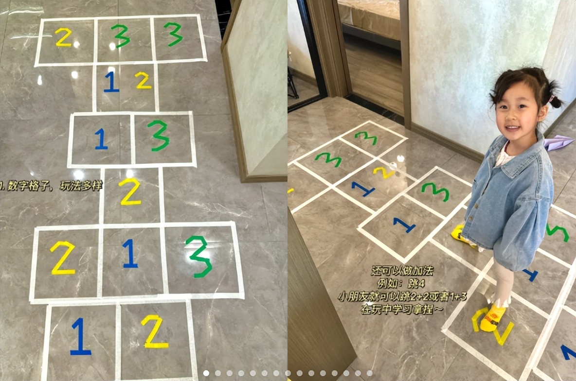 给孩子出一些加减法,孩子算好数字后,就跳进正确的数字格子。