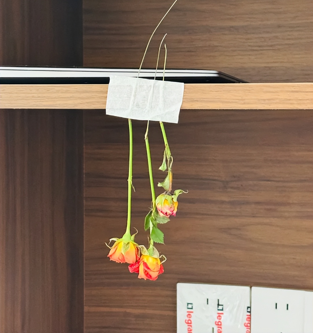 把鲜花倒着放在柜子上,用美纹纸粘贴一下。