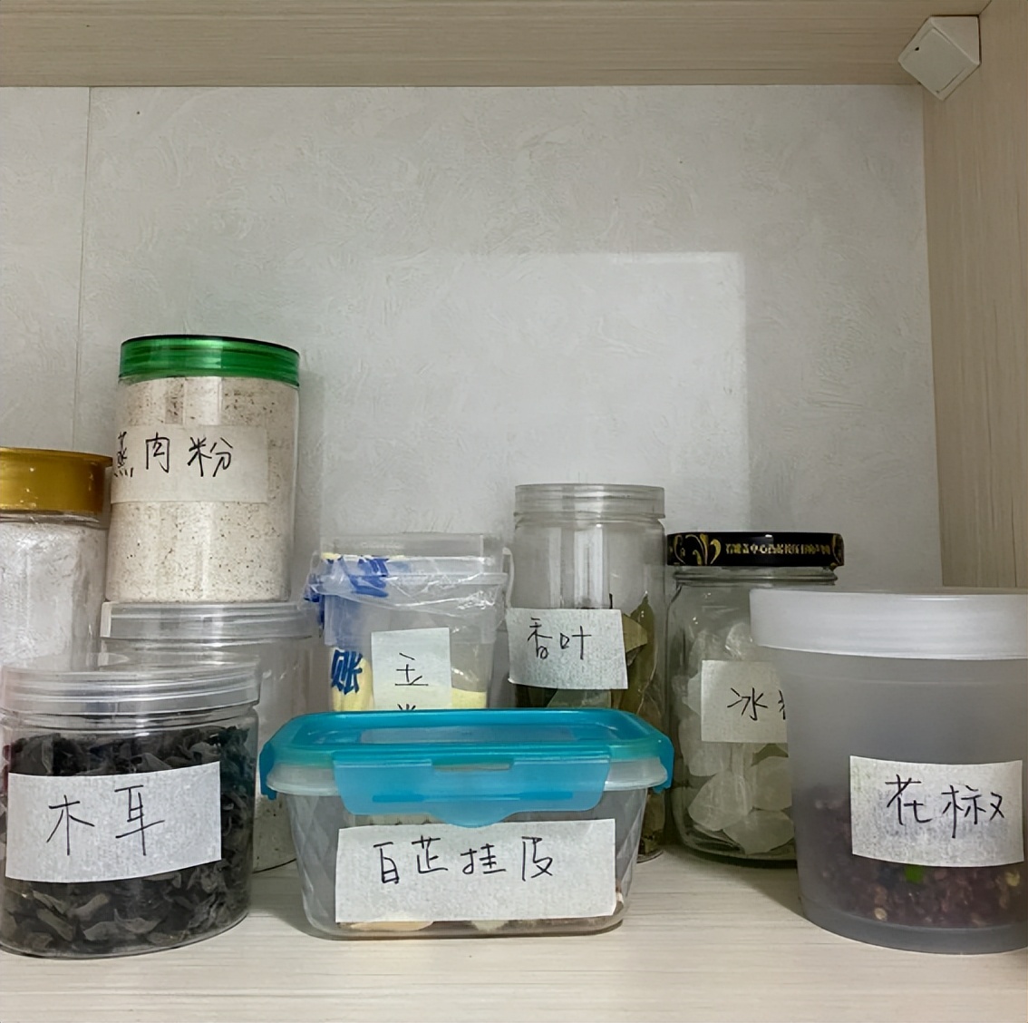 把美纹纸撕下来,粘贴在瓶子上面,写上里面装的东西。