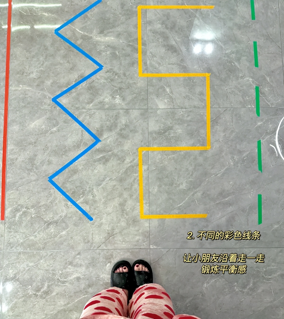 贴好了之后,小朋友沿着走一走,可以锻炼孩子的平衡感。