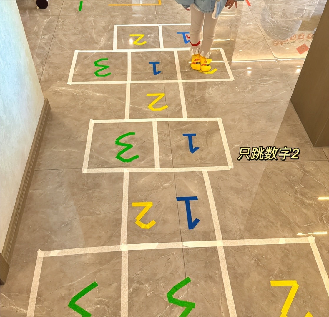 在地板上,用美纹纸贴几道,可以用不同颜色的美纹纸,里面写上数字。