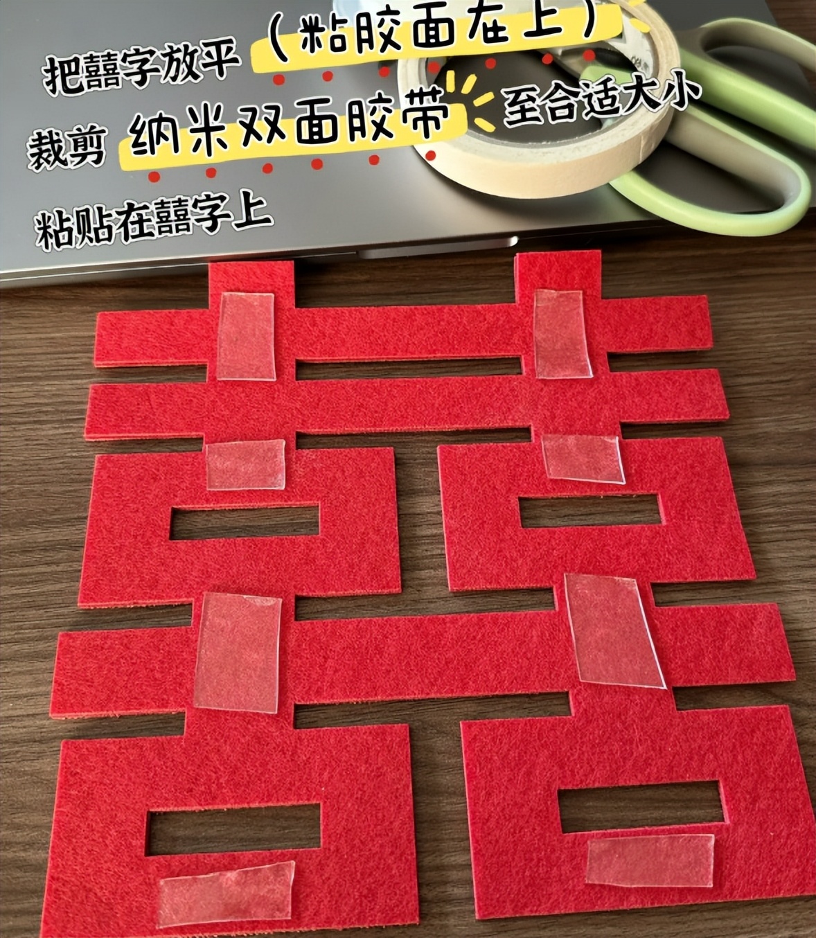 先把喜字放平,把纳米胶剪裁一下,粘贴在喜字上面。