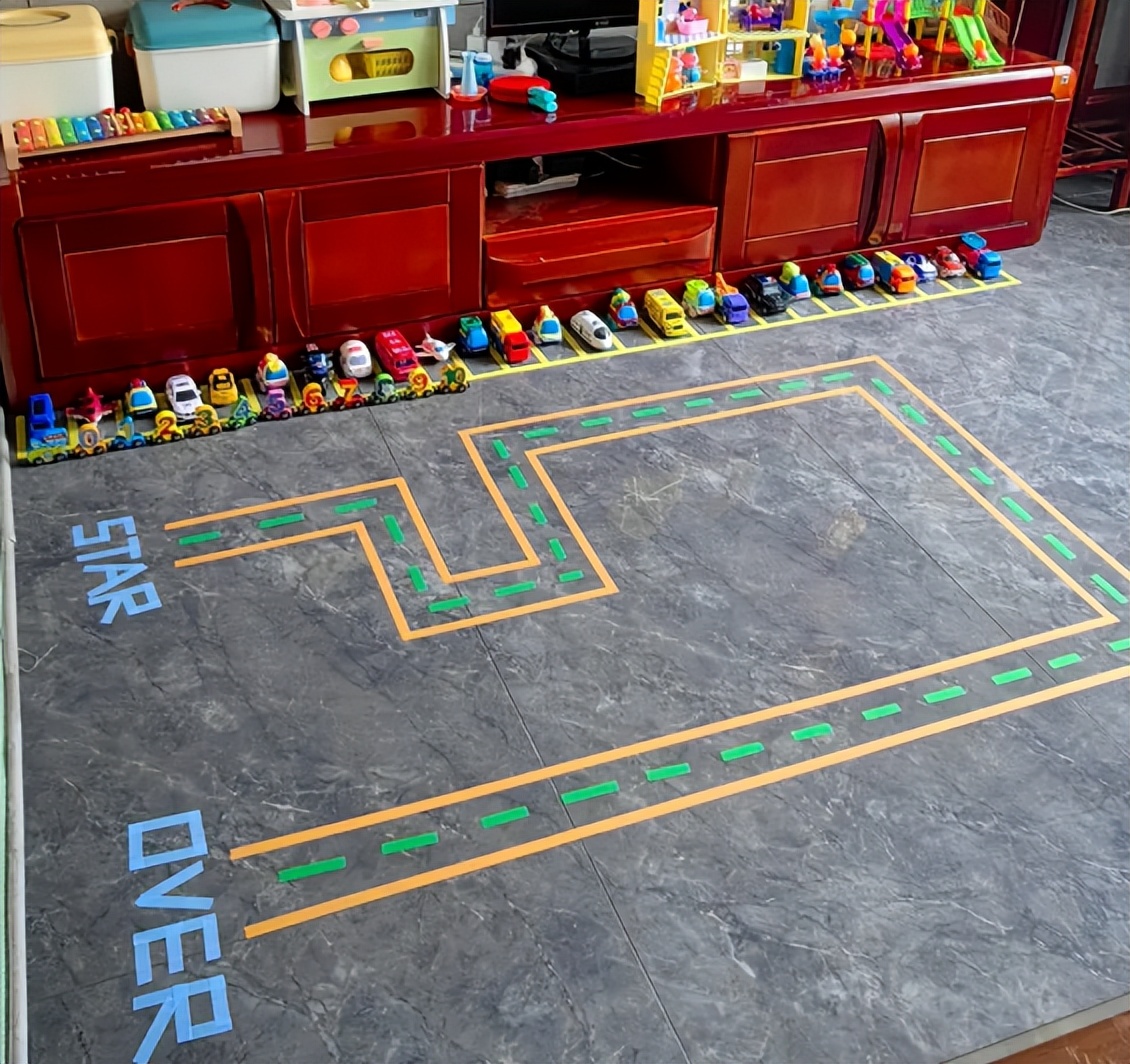 或者在地面上贴在一些停车道、赛车跑道,让孩子玩玩赛车。