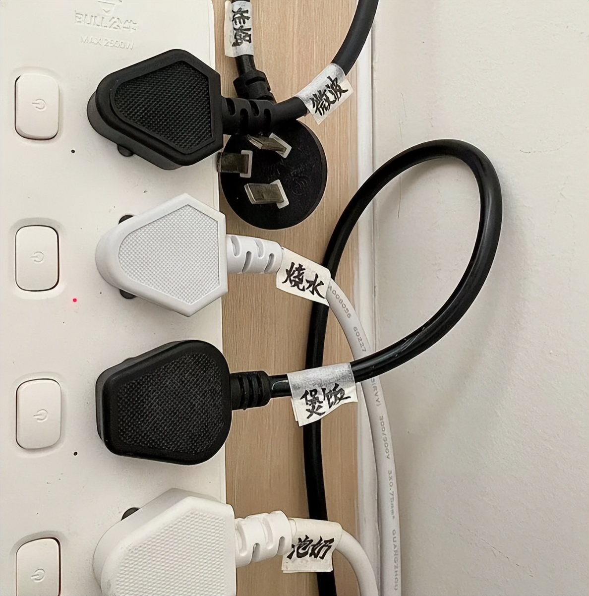 只需要用美纹纸粘贴在电线上,写上每根电线是什么电器的插座,用起来很方便。