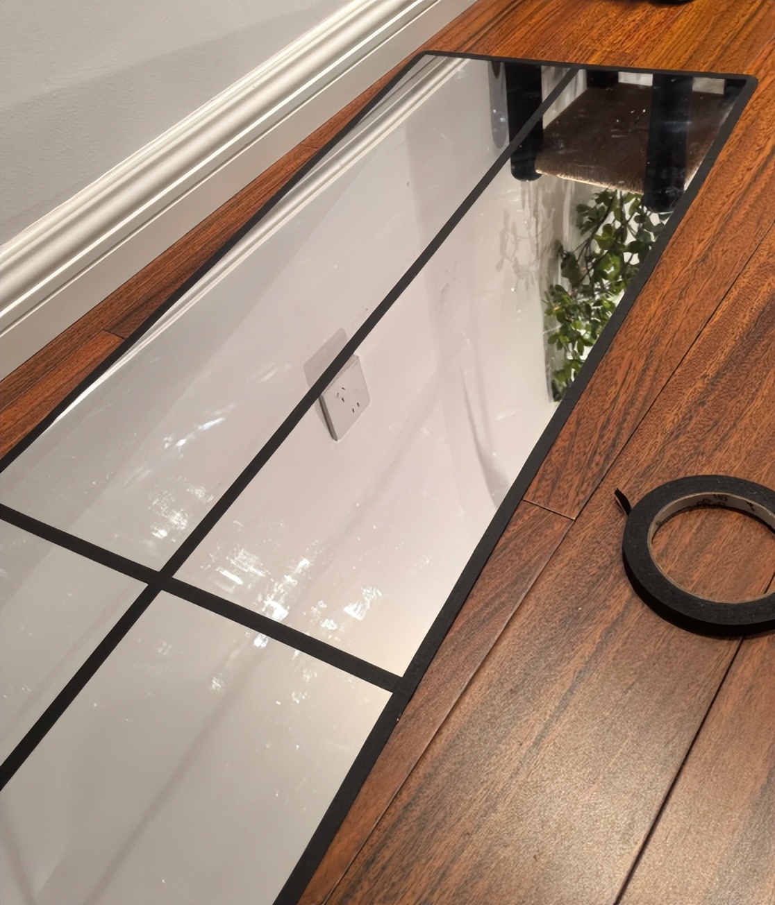 把美纹纸粘贴在镜子上面,用美纹纸粘贴镜子整个边框,然后再用美纹纸把镜子分成几份,最后中间贴一条竖线。