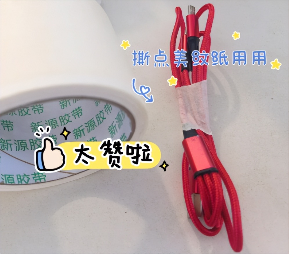 把美纹纸剪裁一小块,再把数据线、充电器线啊,折叠一下,用美纹纸粘贴一下,数据线就这么水灵灵收纳好了。