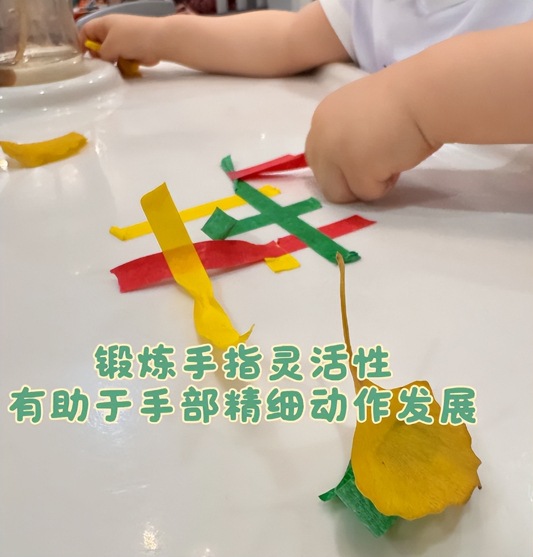 年纪比较小的宝宝,大家可以把美纹纸粘贴在桌子上,让孩子往下撕。