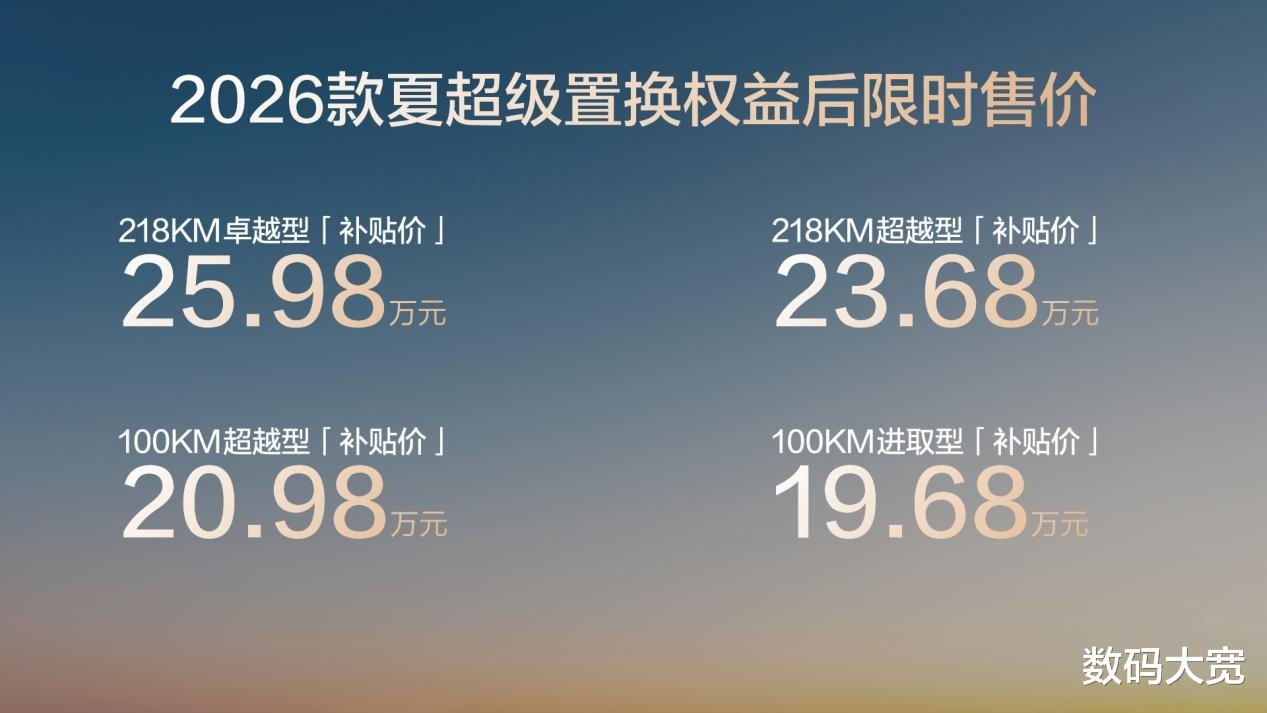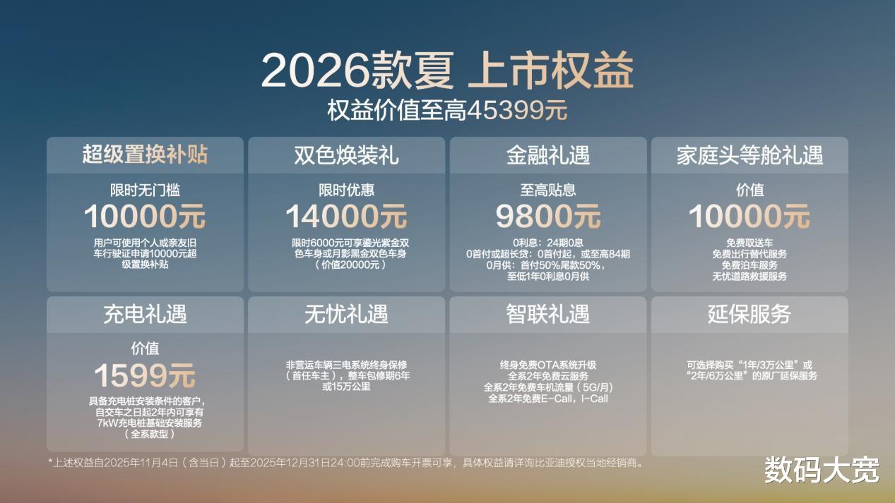 2025年11月4日,2026款夏正式上市,智能座驾终极满足,此次共推出4款车型,限时超级置换价19.68—25.98万元。仅需中级SUV的价格,就可享有超越30万级的豪华配置。