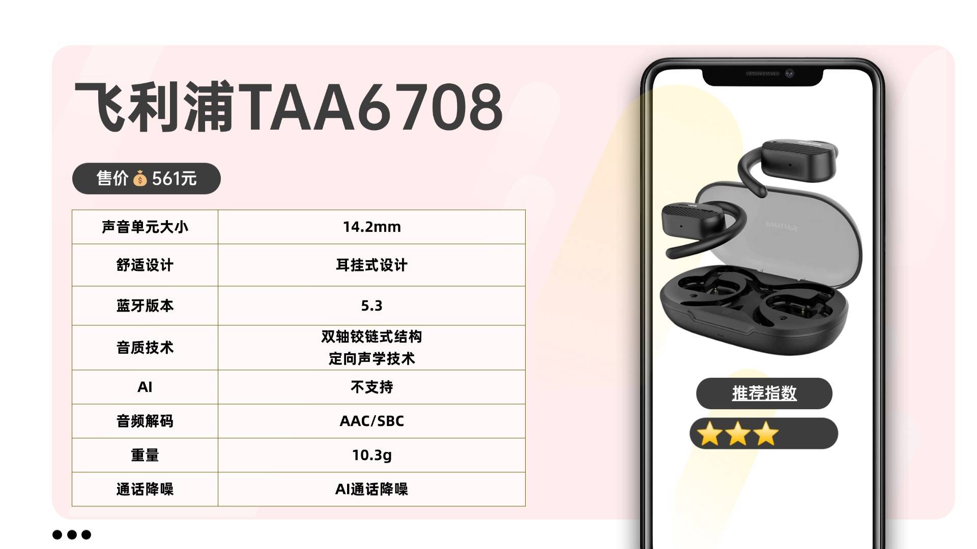 飞利浦TAA6708采用创新的气传导技术,利用空气振动将声音精准传至耳膜,避免了常见骨传导耳机的振感与不适,提供更自然通透的听觉体验。相比传统传声方式,该设计使声音细节更丰富,层次也更清晰。机身设计轻便紧凑,尤其适合运动场景,跑步或骑行时均能稳固贴合,不易滑落,几乎感受不到额外重量。