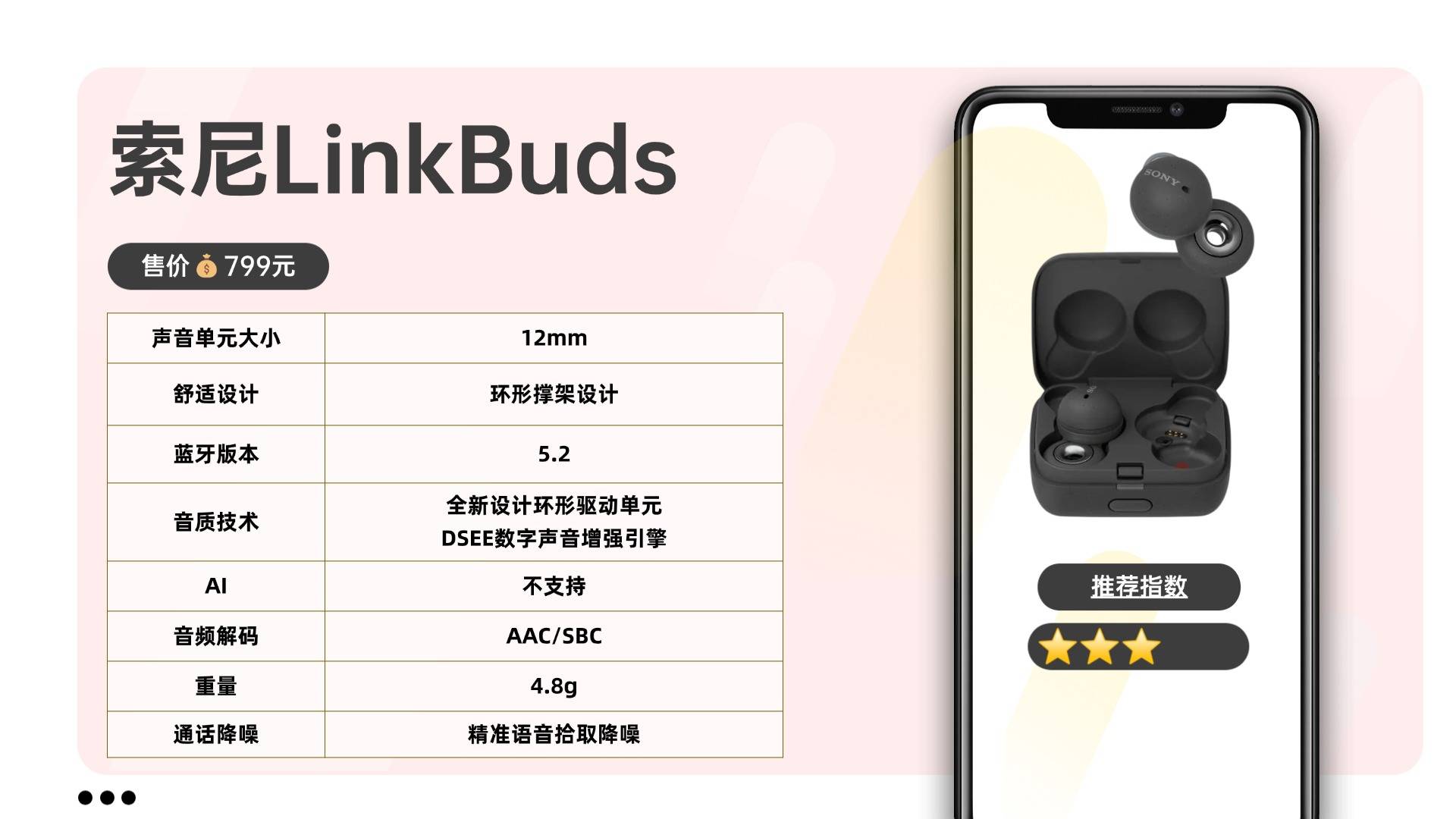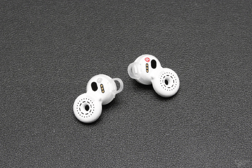 索尼LinkBuds凭借其独特的环形外观,在蓝牙耳机中极具识别度。耳机主体选用环保塑料,触感细腻,整体做工精良,充电盒与耳机在视觉与触感上形成统一。设计风格简约流畅,SONY标识与左右声道标记清晰规整,而左侧单元顶部隐现的微小凸起,更体现出品牌对细节的注重。