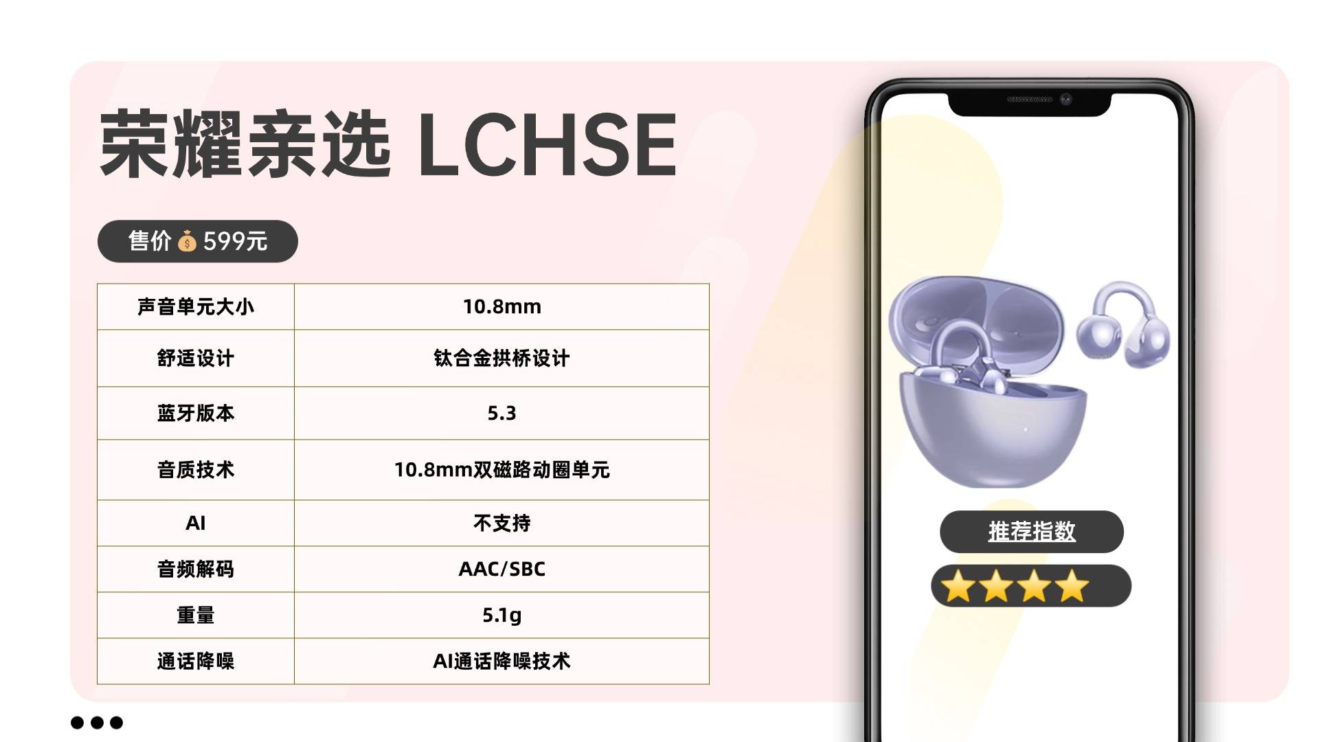 荣耀LCHSE耳机从中式拱桥汲取美学灵感,融合钛合金等多种材质,在科技感中注入传统韵味。耳机外壳由钛合金与耐磨PC共同构成,兼顾轻盈与坚固,单耳重量约5.1克。