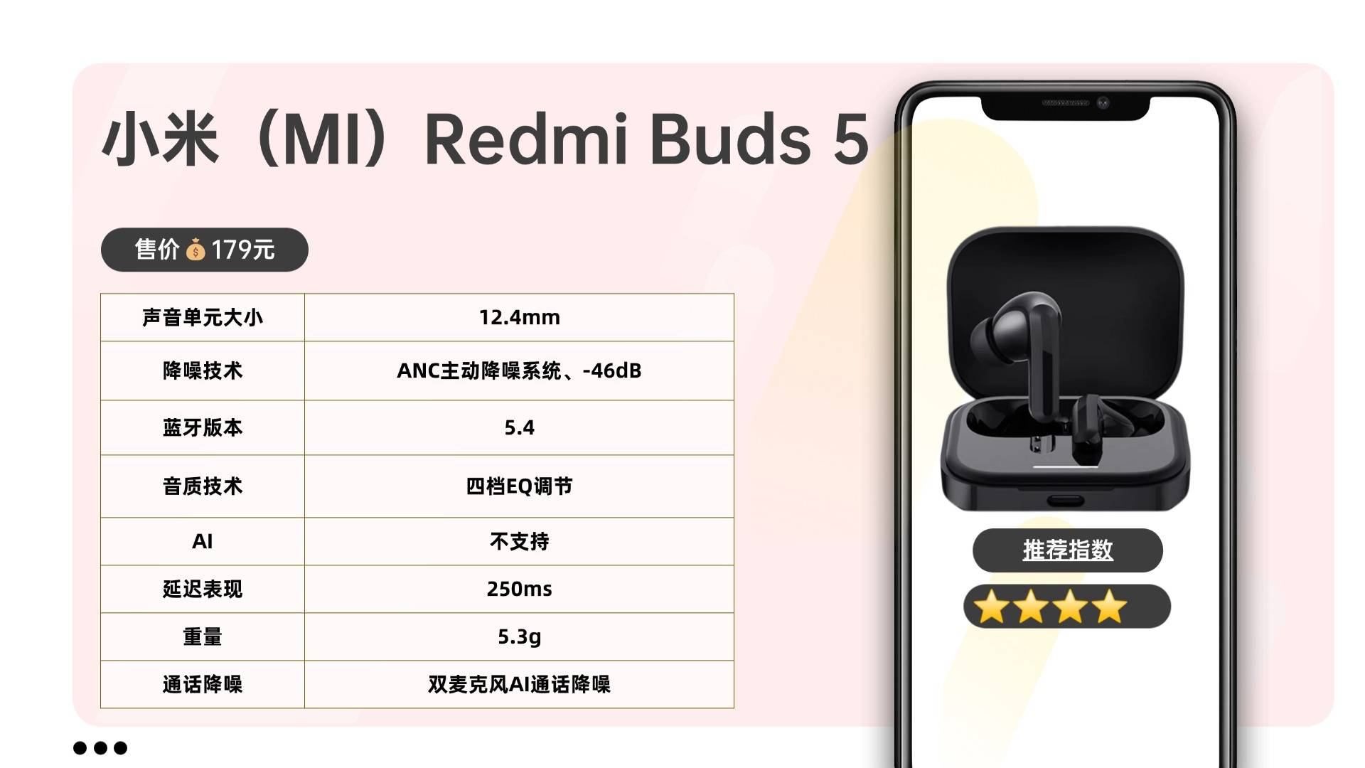 配置上,Redmi Buds 5采用蓝牙5.3芯片,连接稳定,并支持双设备配对与切换。续航方面,单次使用约10小时,配合充电盒可达40小时,满足全天候使用需求。整体来看,功能全面、配置均衡,适合日常通勤与娱乐使用。