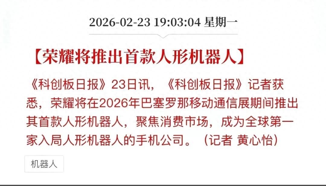 科技浪潮奔涌向前,一个清晰的趋势已然成型:越来越多科技公司将重兵投入人形机器人研发。2026年巴塞罗那世界移动通信大会(MWC)上,荣耀将推出旗下首款消费级人形机器人,成为全球第一家正式进军人形机器人赛道的手机厂商。这一记重磅落子,再次印证:人形机器人不是概念,而是确定的未来方向。