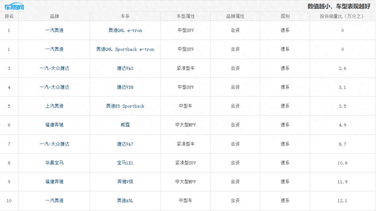 车质网最新发布的德系汽车投诉销量比统计结果近日出炉,这份以"万分之投诉量"为计算方式的榜单,揭示了各款德系车型在市场上的实际质量表现。从统计结果来看,德系阵营内部呈现出明显的两极分化,既有投诉率极低的优质车型,也有表现不尽如人意的产品。一汽奥迪的两款电动SUV以零投诉的优异成绩并列榜首,展现出德系豪华品牌在电动车领域的品质实力。而榜单另一端,一些我们熟悉的热销车型却表现平平,其中一汽-大众速腾以较高的投诉销量比位列统计车型的末位。这种差异不仅反映了各品牌在质量管控上的投入程度,也为消费者选购德系车提供了更具体的参考依据。德系车别乱选!最新质量榜:奥迪包揽冠亚军,宝来速腾未进前30!