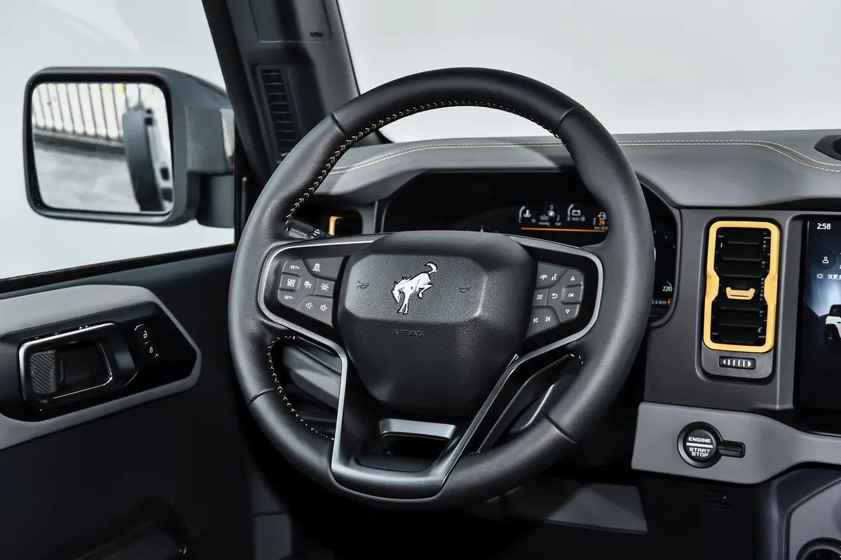 2026款福特烈马的外观,依然延续了硬派越野经典的“方盒子”造型,我个人非常喜欢这种设计,线条平直硬朗,没有那些花里胡哨的曲线。这种设计不仅看着干练,在野外越野时也非常实用,蹭个树杈、刮个石头,方方正正的造型能更大程度减少不必要的剐蹭,修起来也方便。前脸是烈马的标志性特征,那双圆形的LED大灯,内部结构经过精心优化,点亮后眼神犀利,透着一股机灵劲儿。中网是宽大的矩形格栅,熏黑的蜂窝状设计中间嵌着醒目的“BRONCO”字母标识,辨识度极高。走到侧面,车身轮廓简洁有力,贯穿式腰线让这个大家伙看起来并不显臃肿,反而有种修长的美感。轮眉明显宽出车身,搭配高亮喷黑的铝合金防脱轮圈,野性氛围拉满。我这次试驾的是高配版本,那原厂35英寸大轮胎简直就是我的“心头好”,视觉冲击力太强了。车尾的设计同样直截了当,尾灯垂直布局,经典耐看。尾门采用侧开形式,取放东西很方便,特别是我们在野外拿烧烤架、露营装备的时候,非常顺手。这次新车还提供了多种车身颜色,那个新增的“陨石灰”配色特别抓我眼球。比普通黑色更有质感,在阳光下隐隐透着一股高级的灰调,既低调又奢华,非常符合年轻人低调奢华有内涵的气质。