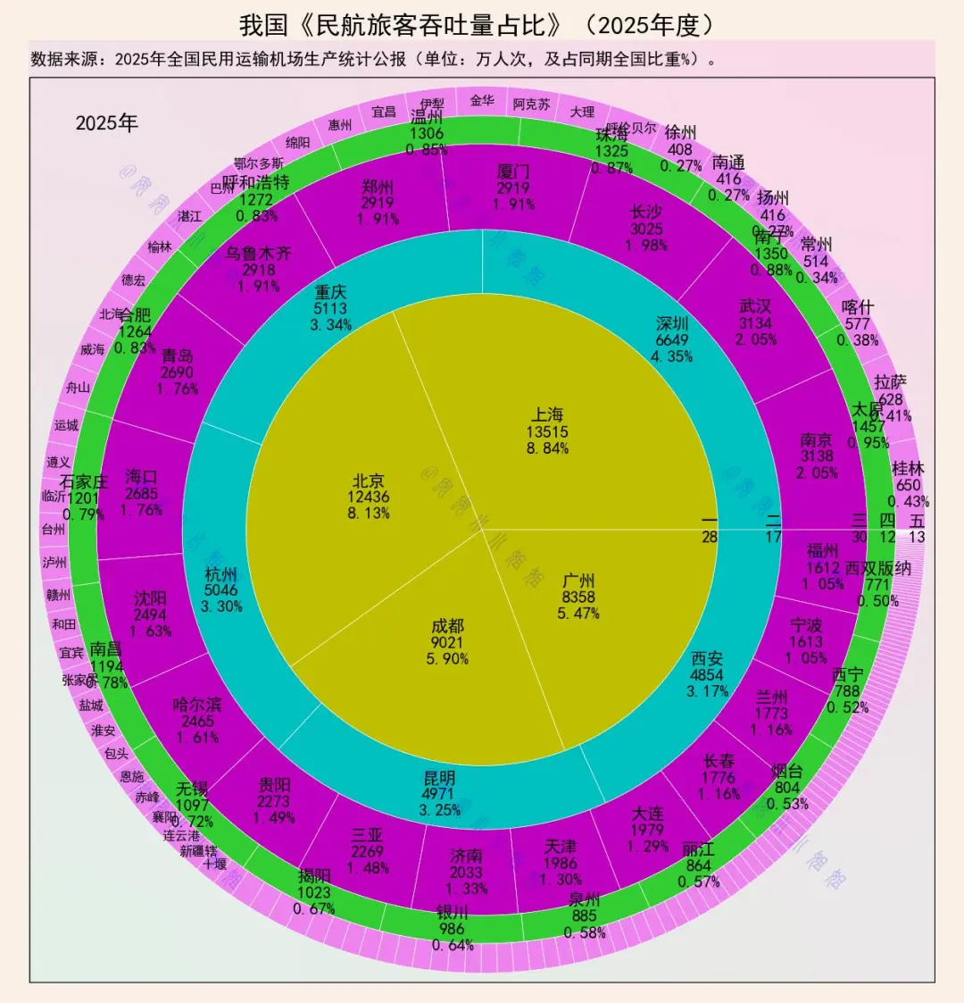 2025 年全国民航运输机场生产统计公报新鲜出炉,一张旅客吞吐量占比的环形图,把国内民航市场的格局摊开在了所有人面前。